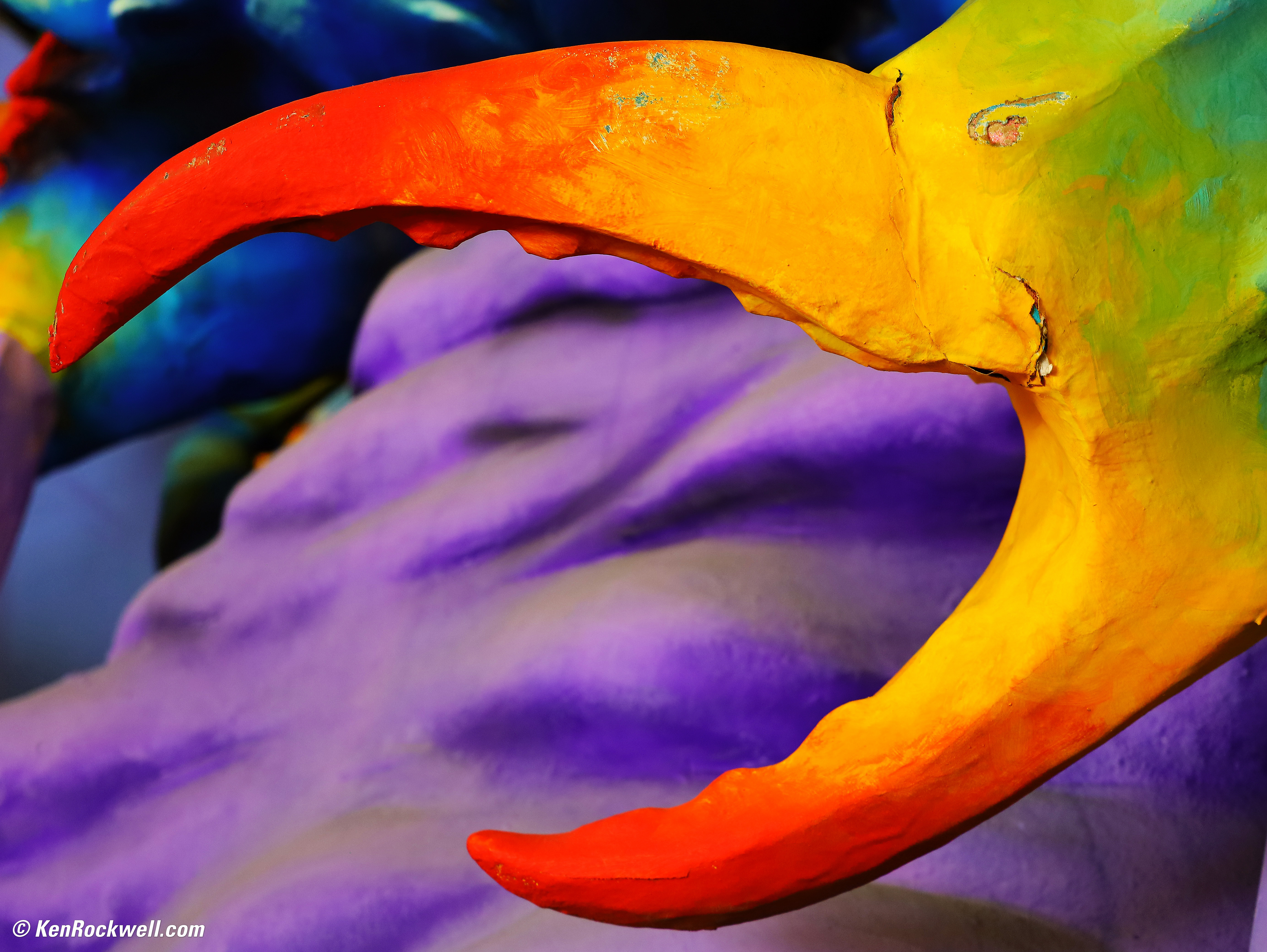 Focus Bracketing, Stacking and Compositing performance topA new "Focus Bracketing" mode is unique to the EOS RP. It's a menu option (MENU > CAMERA 5 > Focus bracketing > Enable) which makes an automated series of shots with the focus bracketed throughout the entire depth of the subject. You then put these images on your Mac or PC and open Canon's free Digital Photo Professional software, which will analyze them and create a single output file in which everything is in focus. I have the directions in my Canon EOS RP User's Guide. It really works, and it's simple and fast enough to be useful. Even in the EOS RP's regular shutter mode this feature runs silently. I don't bother with raw because it's too much work for no benefit, but this is easy and works great. Canon only claims it works with some newer STM lenses, but I got fantastic results with my old USM Canon EF 180mm f/3.5L Macro which came out back in 1996. While it takes more time and a tripod compared to traditional shooting, some of its advantages are that it allows us to shoot at the lens' optimum aperture (usually about f/8) so we have no problems with diffraction and get limitless depth of field. Finally this renders obsolete my ground-breaking work back in the 1980s to calculate the optimum aperture when you need to stop down more for depth of field but don't want to stop down too far to limit the effects of diffraction. Hallelujah! Pros used to have to use expensive TS-E lenses or view cameras to swing and tilt lenses to alter the plane of optimum focus. This is easier and better. This stacking, or "Depth Compositing," also eliminates spherochromatism (colored fringes on out-of-focus areas) because nothing is out of focus! It works over any range of distances. It even works through mirrors where you can see the mirror and then what's in it. The only disadvantage over a single shot is that there's more shooting and there is post-processing, and that if you use strobes in your studio that that you'll probably do better with continuous lighting, as I used in these shots. I don't know that I'd want my strobes popping off dozens of times for every shot, and they would slow me down having to wait for them to recycle after each shot. I don't know that I could program a delay in the EOS RP in any case. Here are two samples: