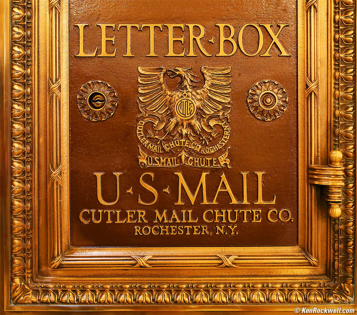 ISO 3,200 High ISOs performance topGolden Mail Box, New Orleans, Louisiana, February, 2019. Canon EOS RP, Canon RF 24-105mm f/4L IS at 31mm, 1/80 at f/4.5 at Auto ISO 3,200, Perfectly Clear. bigger.