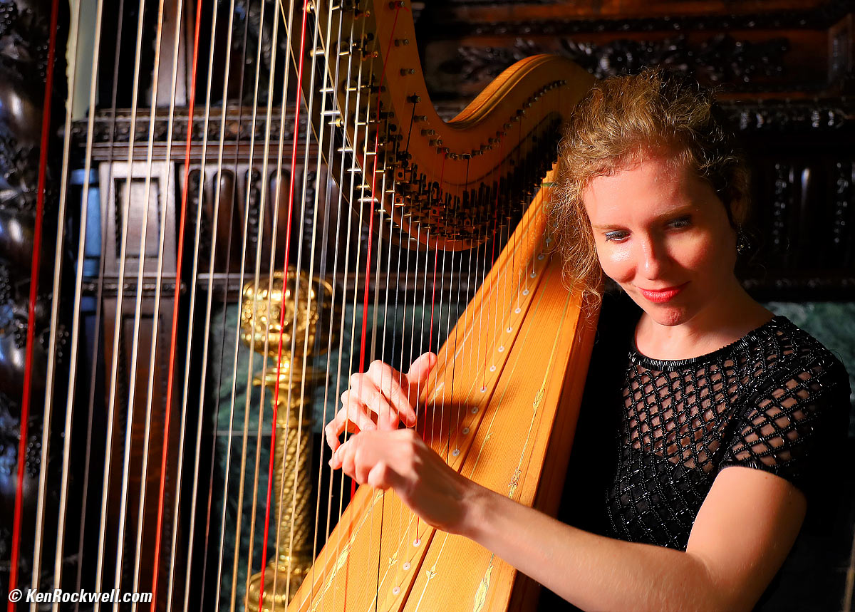 1,080p Movie File with Stereo SoundHarpist, New Orleans, Louisiana, February, 2019. Canon EOS RP, Canon RF 24-105mm f/4L IS. click to play camera-original 1080p MP4 file (350MB). WARNING: this is the full-bandwidth unprocessed file right out of the camera. It's a huge file that may take a long time to download and play. This 90-second file has as much data as watching 20 minutes of regular online video like Netflix! Yes it shoots 4K, but you wouldn't want to download the file to see it. This is recorded with the built-in stereo microphone and people talking in the background.