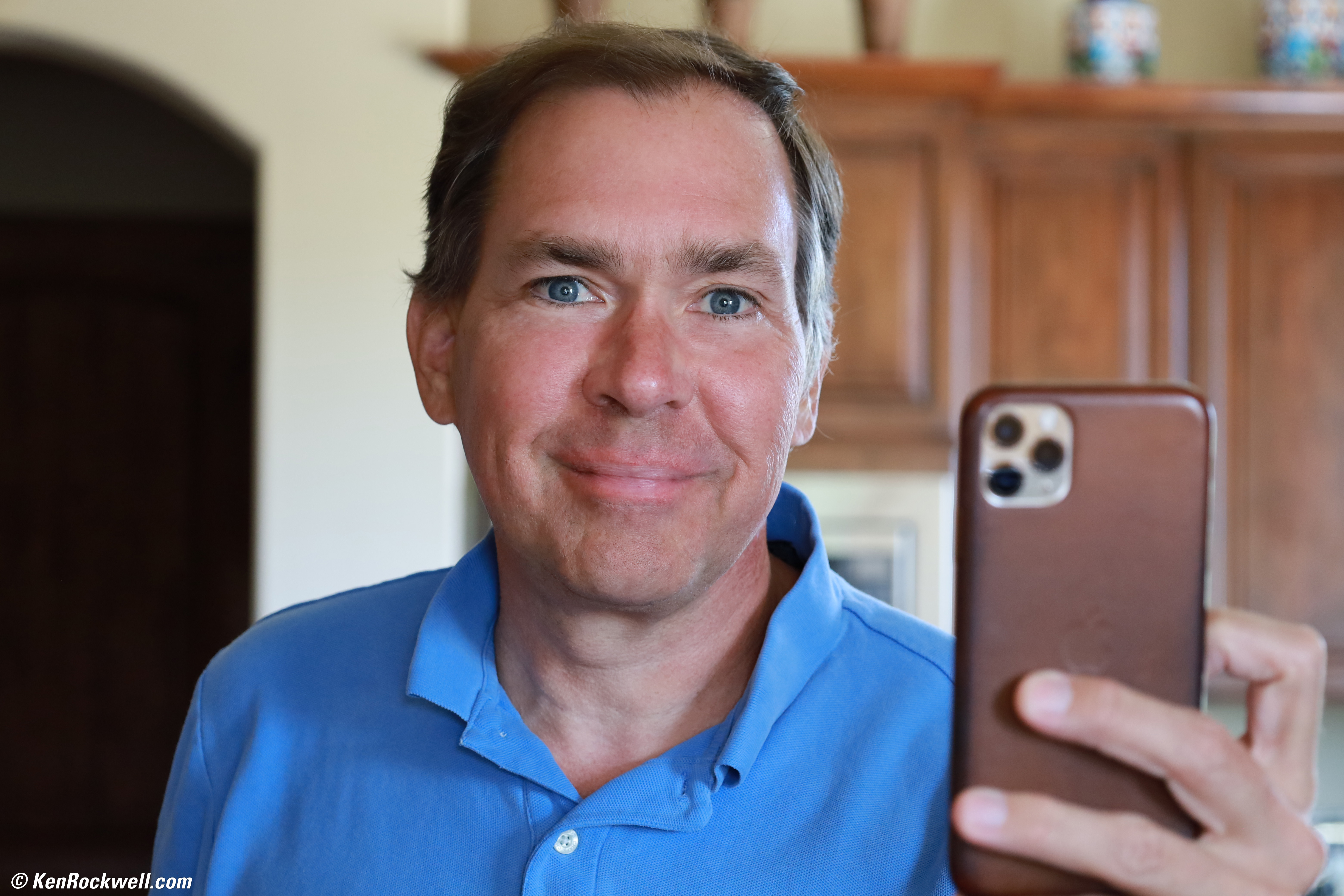 Remote "Canon Camera Control" App performance topCanon's remote "Camera Control" app works, but it's a bit of a pain as are all these apps. It's the best I've used yet, but I rarely use these apps. The EOS RP does a great job of nailing focus on my eyes every time all by itself. Even shot with the RF 85mm f/1.2 DS, my eyes are ultrasharp while my nose and ears go soft. It was easy enough to connect, and easy enough to use. In the shot below I'm tapping the shutter icon in the app on my iPhone 11 Pro Max, and the photo was taken by my EOS RP. Normally you'd hide the phone. Ken Rockwell needs a haircut (2020 lockdown), 2:55 PM, 27 June 2020. Canon EOS RP, Canon RF 24-105mm IS STM at 105mm, 1/40 at f/7.1 at Auto ISO 2,000, as shot in the default settings of the Portrait Picture Style. bigger or full-resolution. A month later when I wanted to try it again, it connected by itself. YES! It always takes about 15 seconds when I wake up my phone, but it did it by itself: Lockdown Hair Gone Wild, 9:18 AM, 13 August 2020. Canon EOS RP, Canon RF 24-240mm IS STM at 188mm, 1/400 at f/6.3 at Auto ISO 10,000, shot in the RP's "Portait" scene mode. bigger. Sorry for you readers, but two months later the app just works, the best I've ever used. It's easy to do self portaits; the AF system just finds eyes and nails them: Six Months, No Haircut! 12:08 PM, 04 September 2020. Canon EOS RP square crop mode, Canon RF 100-500mm L IS at 300mm, 1/20 at f/5.6 at ISO 800. bigger or scary full-resolution file.