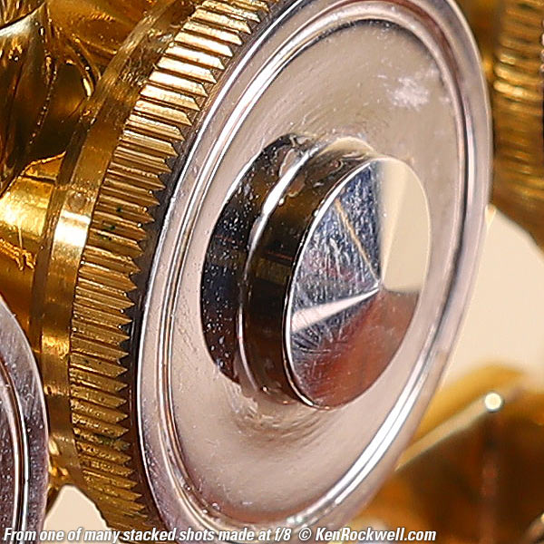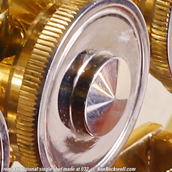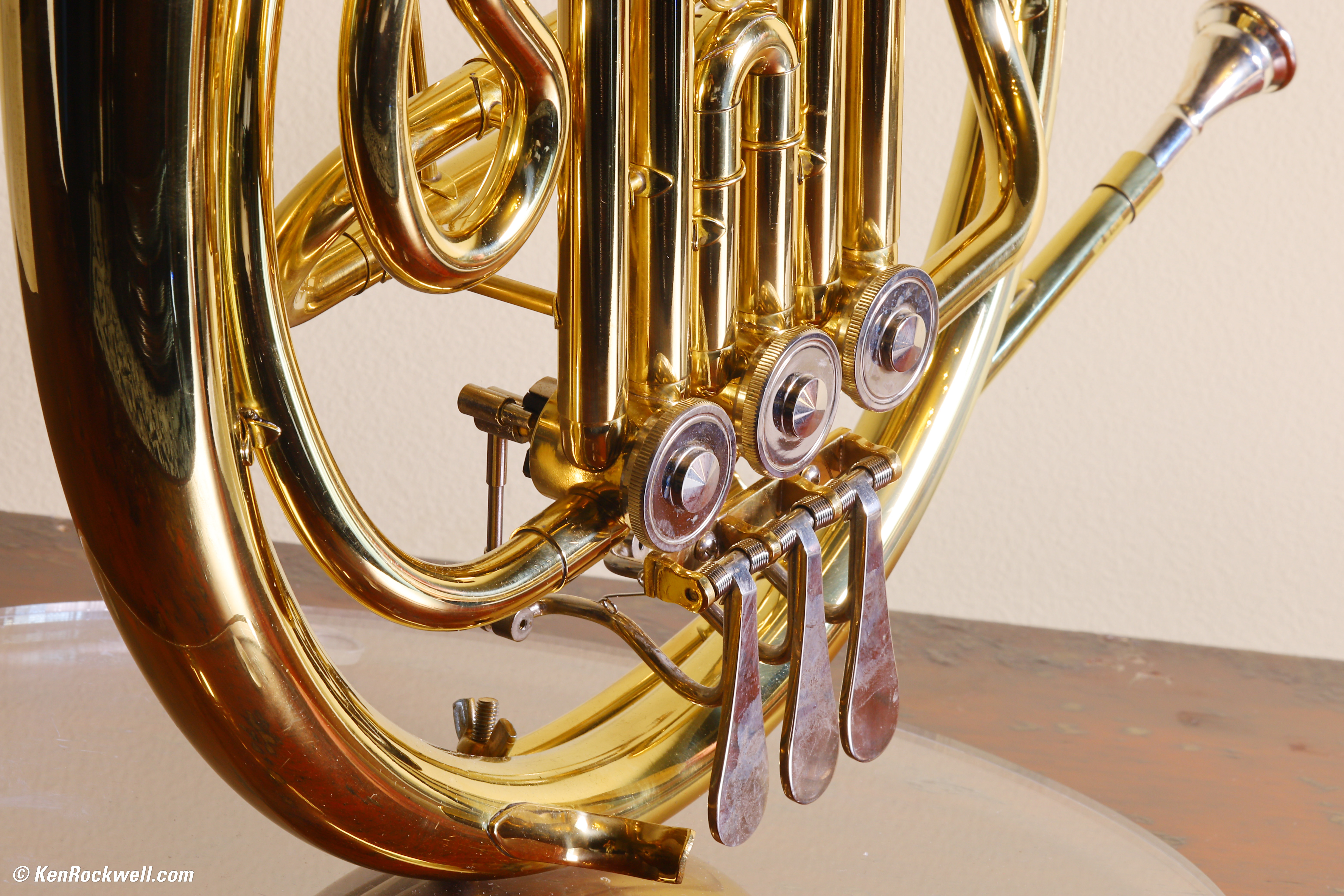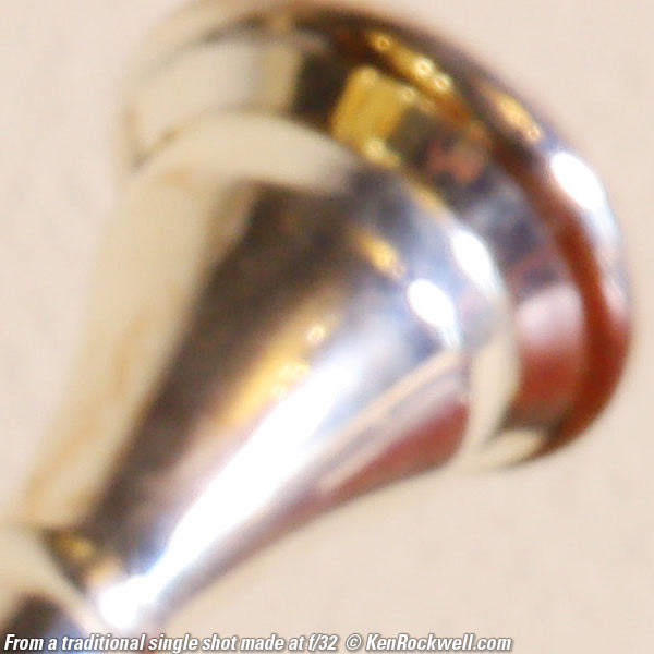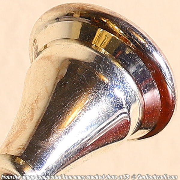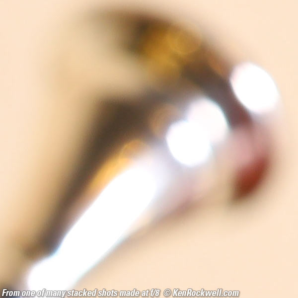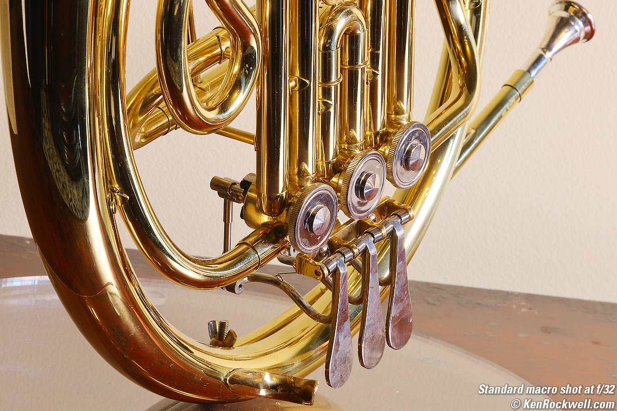 Traditional single shot made at f/32 No one shoots serious macro at f/8 because nothing will be in focus as you see in the shot above. Most macro is shot at f/32 to hope to get more in focus, but as you see here the mouthpiece is still soft: French Horn. Canon EOS RP, Canon EF 180mm f/3.5L Macro, f/32 for 5 seconds at ISO 100. bigger or full-resolution. While the mouthpiece is now much sharper, it's still not sharp enough and diffraction at f/32 has dulled the one valve that is in focus: