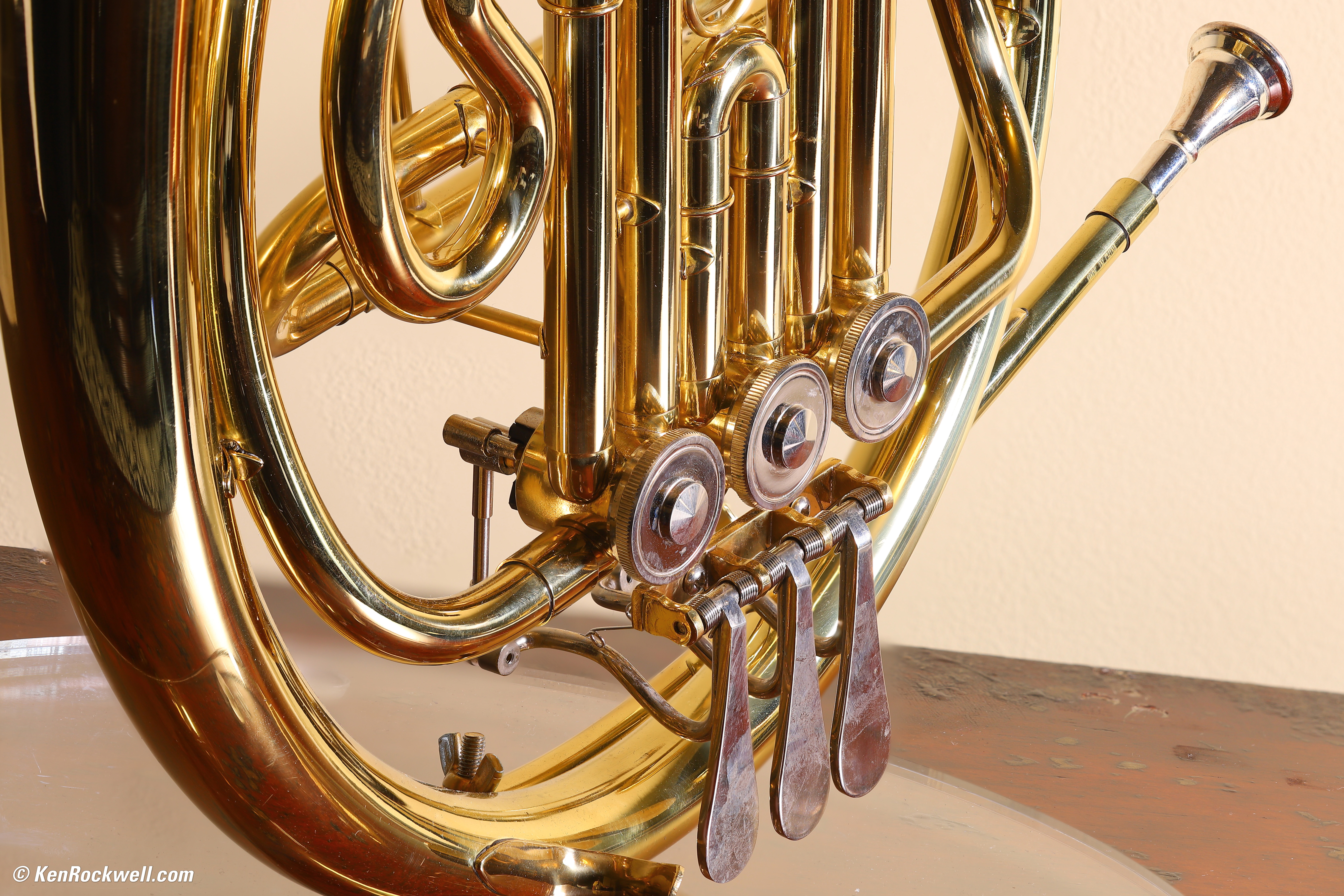 Stacked and Composited Image Taking about twenty focus-bracketed images and compositing them in Canon's free Digital Photo Professional software gives us this miraculous image where everything is ultrasharp. You really need to look at the full-resolution. image to appreciate how insanely and ungodly sharp it is: French Horn. Series of about 20 focus-bracketed shots made with Canon EOS RP, Canon EF 180mm f/3.5L Macro, 1/2 at f/8 at ISO 100 for each of them, processed (composited) in Canon's free Digital Photo Professional software. bigger or full-resolution.