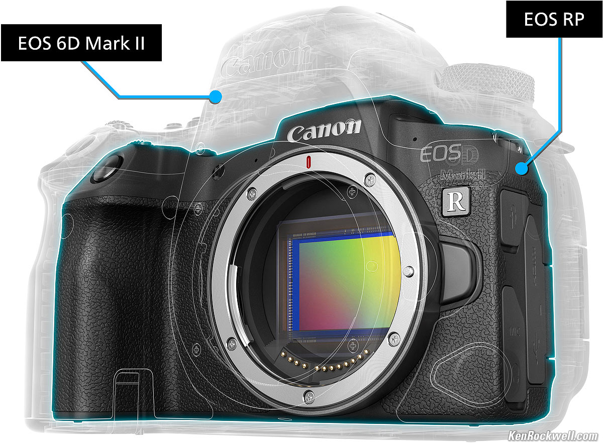 The Canon EOS RP is revolutionary because it's the world's least expensive full-frame mirrorless camera by a huge margin, and it's also the newest and the best regardless of price for what we shoot on mirrorless. It is the World's Best Mirrorless camera because it's even better than the older world-beating EOS R that costs more. The EOS RP handles faster and better than any other mirrorless camera, and weighs much less. The Sony A9 excels if you need high speed, but that's not why we use mirrorless. If you need a pro sports camera, the Canon 1DX Mk II remains the top choice of full-time sports pros. Mirrorless is for travel and light weight and ultra-high image quality, and for all these things the EOS RP excels. 2018's Canon EOS-R, a thousand dollars more expensive, had been my favorite, while this EOS RP upgrades the EOS R's weird rear touch bar, combined mode selector/rear dial into separate mode dials and rear dials, making mode selection now instantaneous in the EOS RP. This new EOS RP is also the world's lightest modern full-frame mirrorless camera; only the very first primitive Sony A7 of 2013 weighs a few grams less. Isn't this why we shoot mirrorless cameras in the first place? This little gem weighs but 17 oz. (485g), the same as the world's first tiny screw-mount LEICAs, while every other full-frame mirrorless weighs about 24 oz. (660g), the same as a much heavier LEICA M camera. Canon EOS RP compared to the small 6D Mk II. bigger. The EOS RP weighs but two-thirds of other modern full-frame mirrorless cameras! Otherwise it's mostly identical to the Canon EOS-R, minus size, weight and leaving an extra $1,000 in your pocket. The EOS RP doesn't have quite the frame rates of the EOS-R, but neither is fast enough for sports, so I'd save the $1,000 and go for this EOS RP whose ergonomics I prefer because of the dedicated mode dial. Otherwise the Canon EOS R and EOS RP feel and shoot the same. Some great things about the EOS RP as well as the EOS-R are that they both show how your pictures will come out before you take them. DSLRs let you view through the lens, but you can't see the actual pictures until you play them back — like film, just faster. The EOS RP has an electronic viewfinder that shows exactly how the picture looks, including all Picture Style (color, contrast, etc.) settings, distortion corrections, white balance, highlights and shadows and exposure all LIVE as you look through the finder. It's a major revolution in photography that will replace DSLRs just as automobiles replaced horses. It will take some years until everyone takes this new kind of camera for granted, but just as digital replaced film, these new mirrorless cameras are replacing DSLRs. We only needed film-era SLR mirrors and ground glass until image sensors became fast enough to read-out in real time. EOS RP body: $799 at Adorama, at Amazon, at B&H and at Crutchfield, or about $545 used at eBay if you know How to Win at eBay. EOS RP & RF 24-105mm STM: $1,099 at Adorama, at Amazon and at B&H. EOS RP & RF 24-240mm: $1,798 at Amazon. EG-G1 grip: $79 in black, in red and in blue.