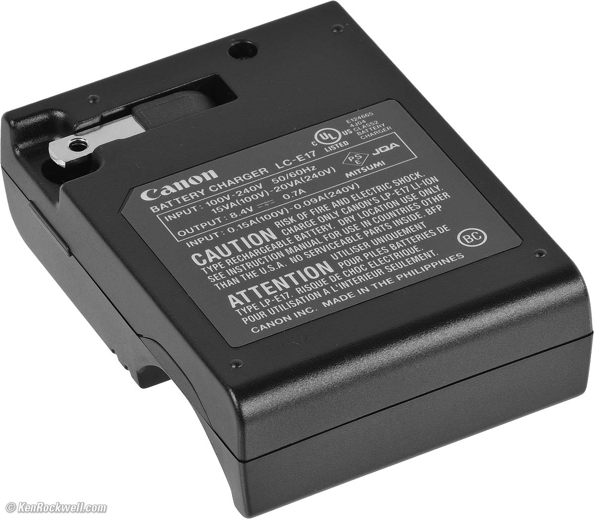 Back, Battery Charger LC-E17.bigger. LC-E17 folding plug 100-240V 50-60 cps charger included in USA. In other areas you may get the LC-E17E charger with a detachable cord. 2.65 x 1.09 x 3.63." 67.3 x 27.7 x 92.2 mm. 3 oz./85g. Rated 2 hour charge time.