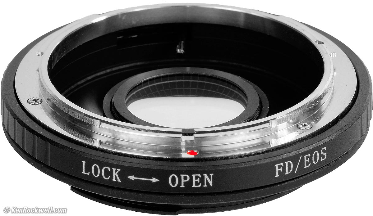 FD Lens CompatibilityThe Chinese make dedicated FD to RF adapters that take advantage of the EOS RP's short 20mm flange-focal-distance. Alternately you use any of the new EF adapters with a classic FD - to - EOS adapter for FD lenses, but they use internal optics that degrade optical performance. With any of these set MENU > C.Fn III > page 7 > Release shutter w/o lens > 1. Enable. This is OFF (2. Disable) by default and the camera won't shoot unless you enable this. I tried this $20 Chinese FD to EOS adapter: $20 Chinese FD to EOS adapter, with internal optics. bigger. And as expected performance wasn't great at fast apertures like f/1.2 due to the adapter's dinky optics; at f/1.2 you get a soft-focus effect. Stopped down it worked OK, but if you're serious about image quality, you're not using adapters and using native RF lenses. Use a dedicated FD to RF adapter for better optical results. As with all non-electronically coupled adapters, exposure was random, often requiring a stop or two of exposure compensation depending on the aperture. It's the same with Sony cameras; with these adapters the camera has no idea of the lens' aperture and has to guess.