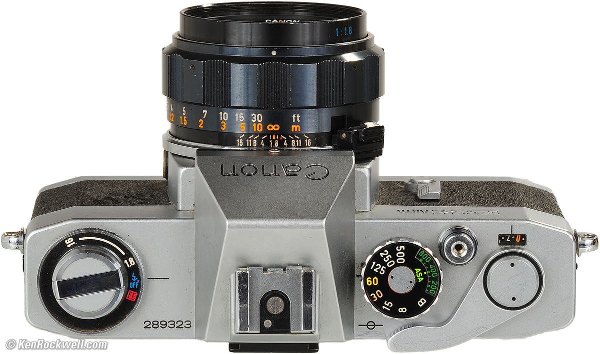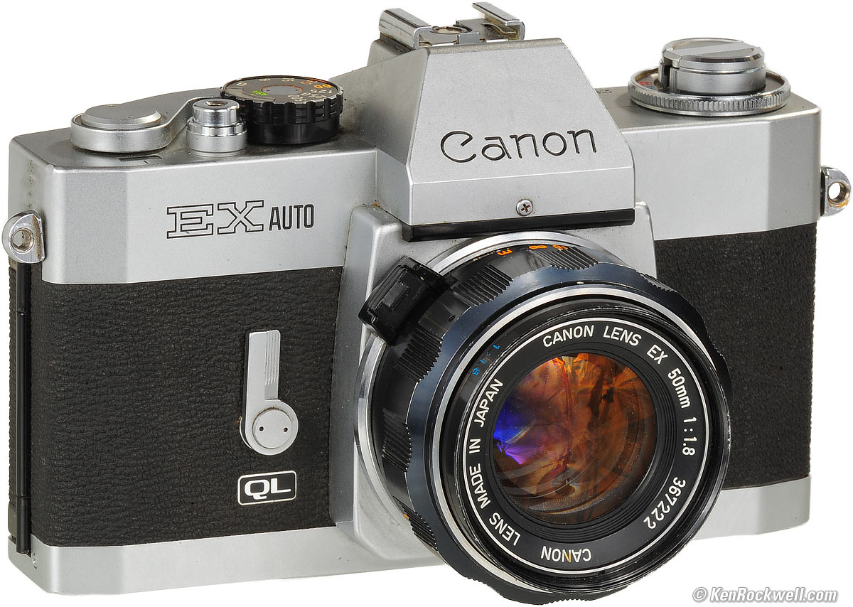 The Canon EX AUTO is a basic 35mm SLR with manual metering, as well as fully automatic shutter-priority EE (electric eye) exposure. Used with the Canolite D speedlight, it automatically calculates perfect flash exposures based on focused distance. Its viewfinder is unique among Oriental cameras. Just like early LEICA SLRs, it presents a sharp, bright aerial image without using ground glass. It has a central microprism for focusing, and otherwise the entire finder is in focus, bright and sharp, just like a rangefinder camera. With the EX AUTO, one cannot see the effects of depth-of-field through the finder. The finder is big as well as bright; bigger and brighter than my Nikon D3! The lenses are only partly interchangeable. The rear half of the lens is permanently attached to the EX AUTO body, while front sections interchange. This has the advantage of making for less expensive accessory lenses, since you only have to buy the front half, and that the camera is never open to dust and dirt while changing lenses. The combination of an aerial image finder and a sealed mirror box means that the finder of this 40-year-old camera is still bigger, brighter and more free of dust than my new Nikon DSLRs. Ha! QL means Quick Load. To load, all one does is pull the film across and close the back; there is no threading or any of the other foolishness needed with LEICAs. It loads much faster than my manual-focus Nikons, too! This Canon EX AUTO replaced October 1969's similar Canon EX EE in February 1972. They use the same lens components.