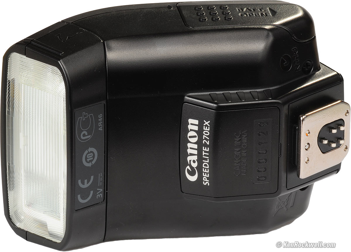 The Canon 270EX Speedlite is a small, inexpensive and sturdy little flash for any of Canon's DSLRs. It even has a tiny manual zoom head, and bounces vertically. It will not work on Canon's older film EOS cameras that use the TTL autoflash mode. This 270EX flash only works in E-TTL and E-TTL II modes. All functions, like exposure compensation, rear sync, high-speed sync and manual power output are controlled by the camera and its menu system. Unfortunately, it has two tiny little flaws which are big problems. I suggest the older Canon 220EX instead, which fixes these, and also works on older cameras.