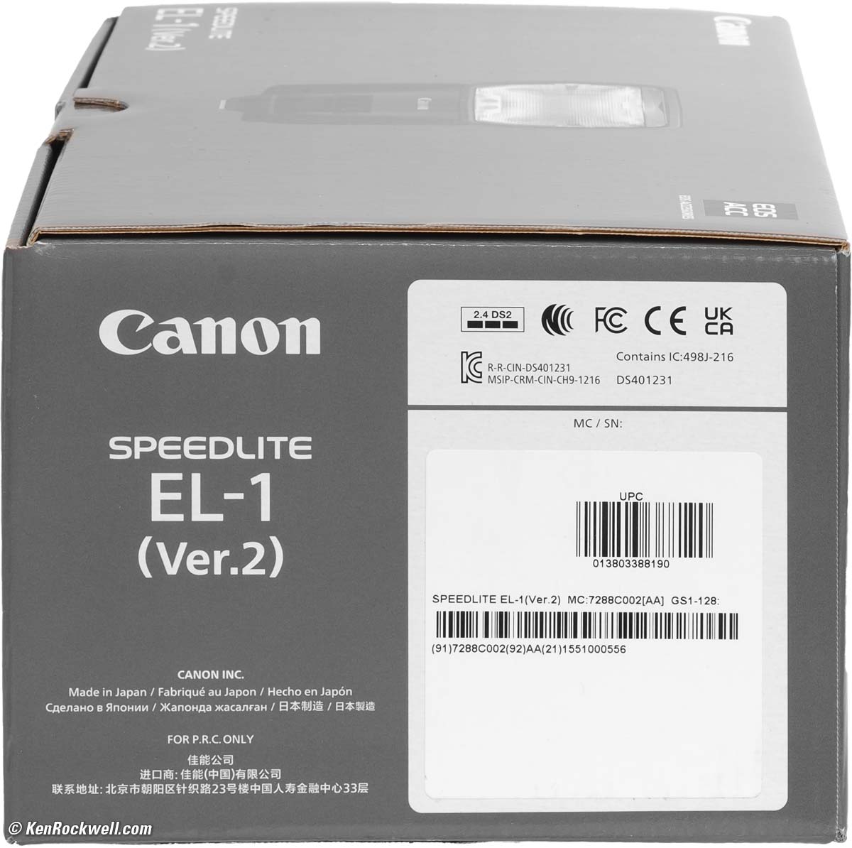 Canon EL-1 v20.9s Full-Power RecyclingLi-Ion Battery & Charger IncludedRadio & Optical Control (2025-today)Introduction New Good Bad Missing Compatibility Specifications Accessories USA Version Performance Compared R1 R3 R5 II R5 R5C R6 III R6 II R6 R R8 RP R7 R10 R50 R50V R100 Bodies Compared RF Lenses EF Lenses Flash Canon EL-1 Version 2 Speedlite Flash (23.7 oz./671g with included LP-EL battery, 24-200mm zoom head with 14mm wide panel and catchlight card, 0.9 second measured recycle time, measured GN 78'/24m at 35mm or 127'/39m at 105mm, $1,249). bigger. I got mine at B&H. I'd also get mine at Adorama, at Amazon, at Crutchfield, or used at eBay if you know How to Win at eBay, or get it used at KEH. This 100% all-content, junk-free website's biggest source of support is when you use those or any of these links to my personally approved sources I've used myself for way over 100 combined years when you get anything, regardless of the country in which you live. Canon does not seal its boxes in any way, so never buy at retail or any other source not on my personally approved list since you'll have no way of knowing if you're missing accessories, getting a defective, damaged, returned, non-USA, store demo or used flash — and all of my personally approved sources allow for 100% cash-back returns for at least 30 days if you don't love your new flash. I've used many of these sources since the 1970s because I can try it in my own hands and return it if I don't love it, and because they ship from secure remote warehouses where no one gets to touch your new flash before you do. Buy only from the approved sources I've used myself for decades for the best prices, service, return policies and selection.