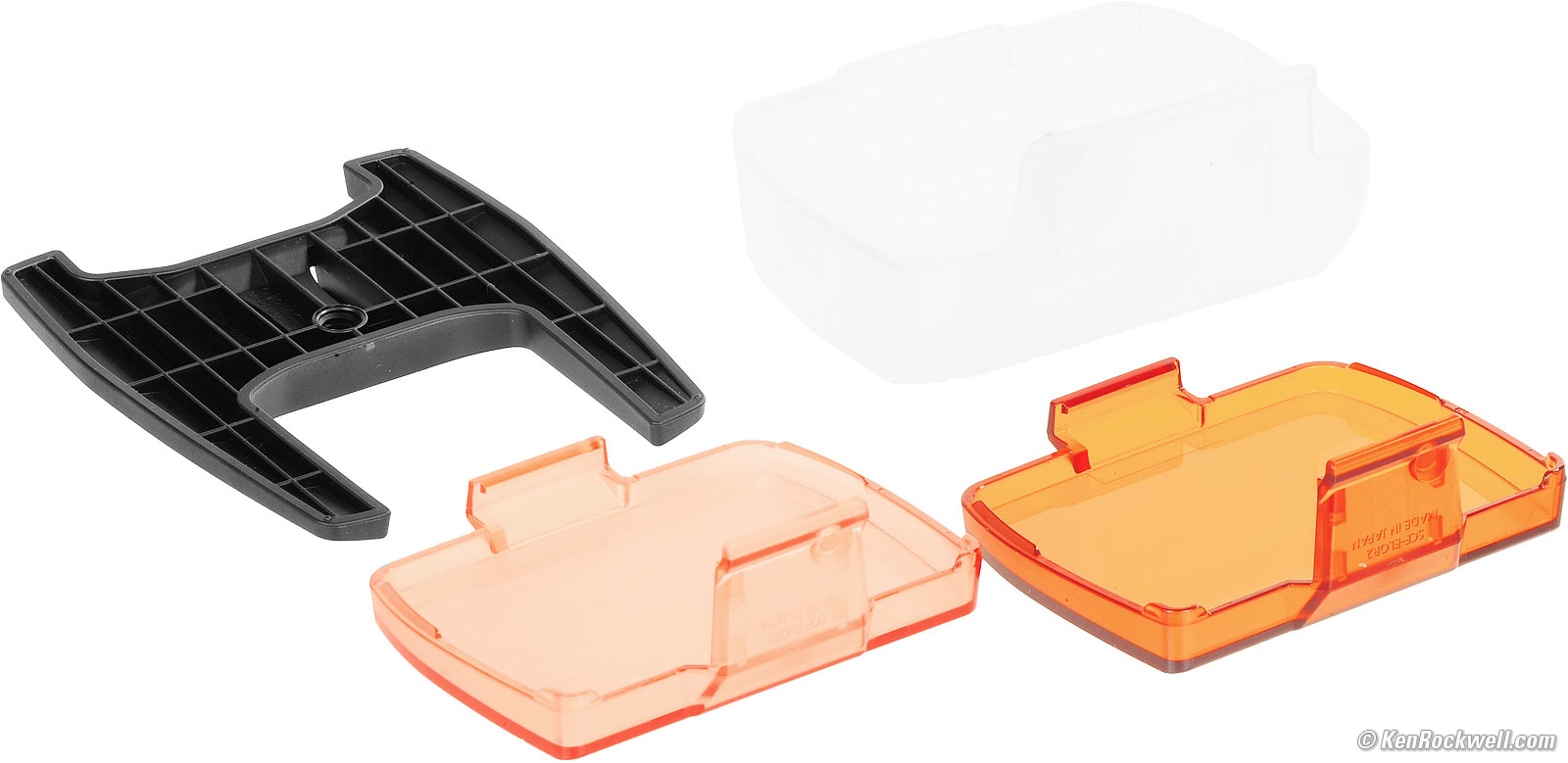 Colored Filters user's guide topIncluded Stand, Sto-Fen-style Diffuser (SBA-EL), ⅓ CTO (SCF-ELOR1) & CTO (SCF-ELOR1) Filters for Canon EL-1 v2. bigger. Pro practice is to filter your flash to match the ambient light. Otherwise subject and background take on different color casts — yuck! In daylight, no filter is needed as the flash matches daylight. Indoors with tungsten or 3,200K or 2,700K lighting, use the deep orange filter to make the flash match the ambient light. With most cameras set to Auto White Balance the system will magically reset to match the flash because the EL-1 v2 has little feelers that detect which filter you're using and sets the white balance accordingly. Clever! Using the deep orange filter indoors will prevent very warm backgrounds or blue people. You get either one or the other or a combination of both if you don't match the flash to ambient light, but use the filter and all should look awesome. Also use either orange filter to taste when the flash is used for fill at sunset — but set your white balance manually to preserve the orange glow to taste (otherwise the Auto WB will try to make everything look too blue). If I can't avoid shooting under fluorescent light, I use a a small piece of green fluorescent conversion filter taped over the flash. Canon doesn't include one of these. For manual exposures, the light orange filter eats up ⅓ stop of light, and the deep orange filter uses 1 full stop of light.