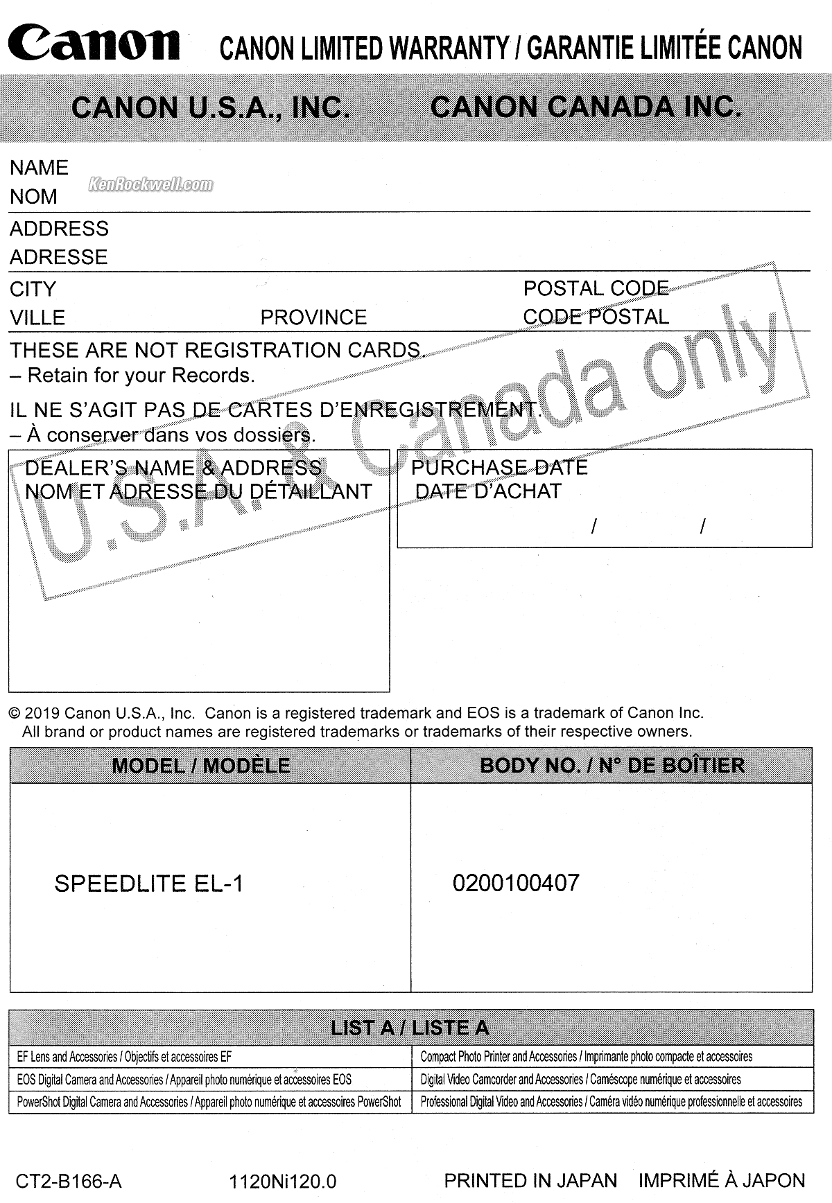 This section applies in the U. S. A. only. I got my EL-1 v2 at B&H. I'd also get mine at Adorama, at Amazon, at Crutchfield, or used at eBay if you know How to Win at eBay, or get it used at KEH. Using any of these links when you get anything is a huge help to support this all-content website. EL-1 USA Warranty card. bigger. Your flash must include a U. S. A. warranty card like the one shown above from Canon U.S.A., Inc. It should be on top inside your box as you open it. The serial number on the card must match the serial number on the sticker on the bottom of your flash head. If not, you got ripped off with a gray market version from another country. This is why I never buy anyplace other than from my personally approved sources. You just can't take the chance of buying elsewhere, especially at any retail store, because non-U. S. A. versions have no warranty in the U. S. A., and you probably won't be able to get firmware or service for it — even if you're willing to pay out-of-pocket for it when you need it! Shifty dealers may include color copies of a card from a legitimate U. S. A. item in a gray-market box, hoping you won't check serial numbers and catch their fraud. A card with the wrong serial number means nothing other than that you have no warranty coverage. The serial number on the box on the sticker below the UPC code doesn't have to match, but it should. If not, it means a shady dealer took things out of boxes and was too sloppy to put them back correctly — and it means you got a used lens if anyone other than you took it out of the box. If a gray market version saves you $500 the risk might be worth it, but for $200 or less I wouldn't risk having no warranty or support. Always be sure to check yours while you can still return it, or just don't buy from unapproved sources or at retail so you'll be able to have your camera serviced and get free updated firmware as needed. Get yours from the same places I do and you won't have a problem.