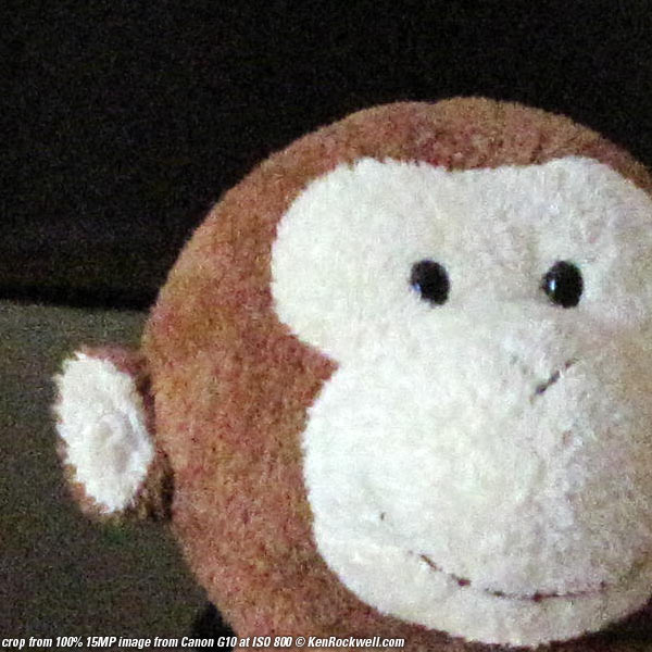 High ISOs High ISOs are as awful as every other compact camera. If this matters to you, buy any DSLR, and not a compact camera. The G10 excels for use in good light; but don't push your luck in the dark. For instance, here is how the G10 compares to a Nikon D40 at ISO 800. Since the D40 has far fewer pixels, I had to enlarge the D40 image to match. These are crops from a very small central area. Crop from 100% 15MP G10 image at ISO 800. Roll mouse over to compare to a Nikon D40 SLR. See what I mean? Not only is the D40 image far cleaner, but since the G10's noise reduction is working so hard, it smoothes over details and the D40 image is also sharper. Not only does the D40 have far more detail in the fur, realize that this is from a D40 image that has been upsampled to match the same magnification as the G10. Both cameras were zoomed to match the same framing. I used the kit lens included with the D40.
