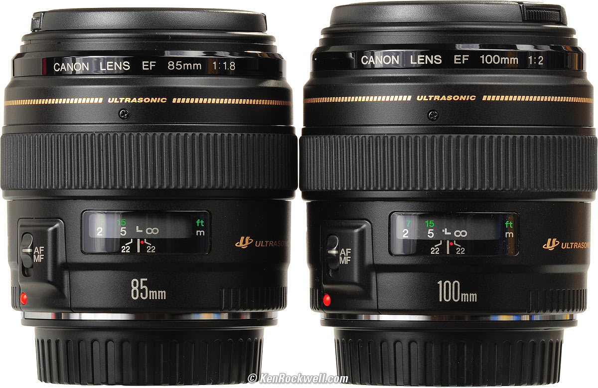 Compared to the Canon 85mm f/1.8 USM Canon 85mm f/1.8 USM and 100mm f/2 USM. enlarge. The Canon 85mm f/1.8 USM is almost same as this 100mm f/2 lens. The 85mm is only a tiny bit shorter and weighs just 17g (0.6 ounces) less than the 100mm. (Canon's specifications are out-of-date; I actually measured two samples in 2010.) Optically, both are fantastic. The 100mm is very slightly sharper, especially in the corners on full-frame wide-open (see also Canon's MTF data for the 85mm and for the 100mm), but it's so similar that I'd never notice it. Either is better than an L zoom, and either makes the images from the 28-135mm IS at 100mm look like it was shot with a toy camera. Any sharpness difference between the 85mm and 100mm isn't important. They both focus almost instantly. Neither has any visible distortion. The 100mm gives a slightly larger macro ratio, focusing almost as close (0.9m vs. 0.85m) as the 85mm, but with a longer focal length. What I do notice is that the bokeh of the 85mm is better. More importantly, I observed that the particular sample of 100mm I tried in 2010 more often gave sharper results on my particular sample of 5D Mark II, even after AF microadjustment, than did the 85mm, because the 100mm focused more accurately more often at large apertures. The real reason I got the 100mm instead of the 85mm I thought I wanted (it costs $55 less) is that the front filter threads of the 100mm are solid metal, and simply plastic on the 85mm. I use a lot of filters, so the 100mm feels like a tool while the 85mm feels a little more like a toy. The front barrel between the focus ring and filter threads of the 100mm is also metal, not plastic. Thus I bought this 100mm USM instead of the 85mm.