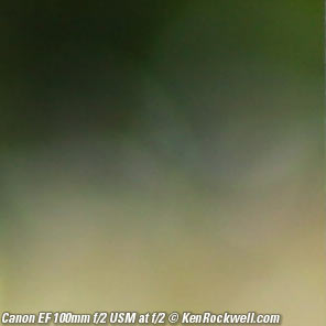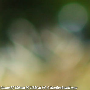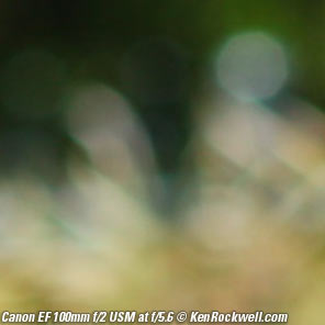 Bokeh performance top Bokeh, the quality of out-of-focus areas as opposed to the degree of defocus, is nothing special. Backgrounds are way out-of-focus at f/2, however their character (bokeh) isn't all that smooth. Bokeh is reasonably so-so at f/2, and neutral at smaller apertures. At larger apertures, bokeh takes on more of an organic feel, almost like lenses from the 1950s. Here are crops from extremely enlarged prints of about 36 x 55" (100 x 150cm), or the equivalent of looking at Canon 5D Mark II images at 100% on-screen. In these examples, the lens was focused on a vertically polarized phase lattice at 3 meters (10 feet), and the synthetic reference vegetation seen out-of-focus in the background was at 15 meters (50 feet).