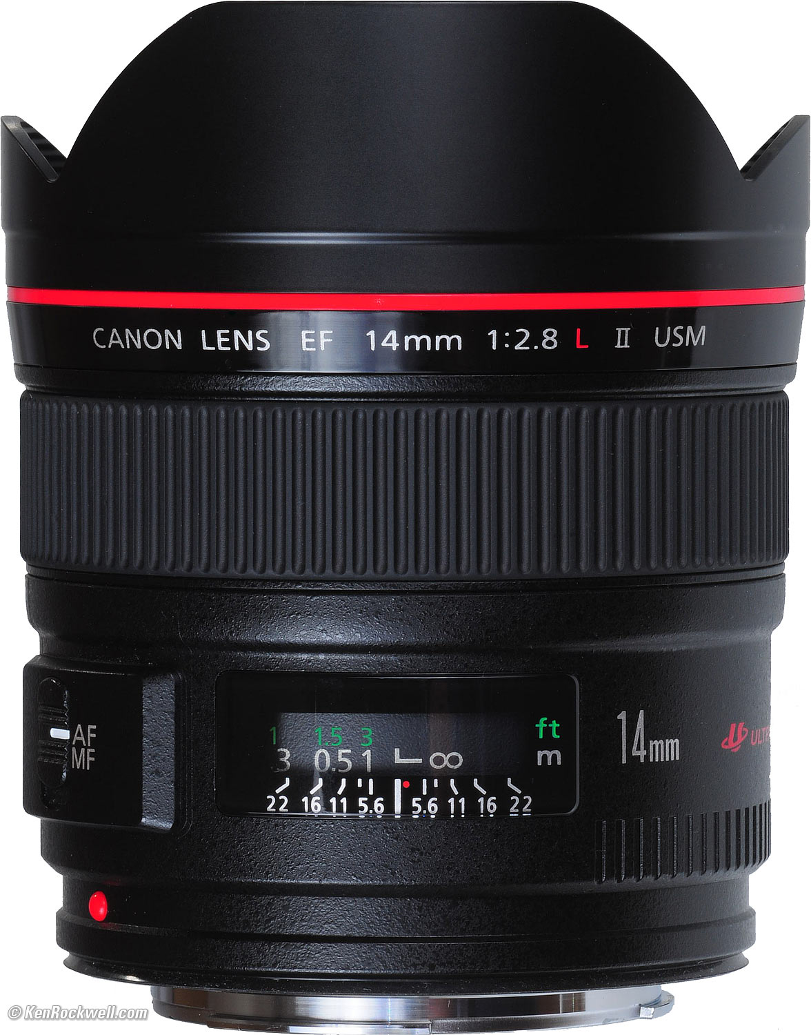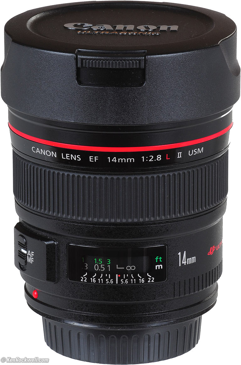 Name Canon calls this the Canon Lens EF 14mm f/2.8 L II USM. EF: Electronic Focus. All modern Canon lenses focus with a motor in the lens. L: Expensive as L. No exact meaning other than this being Canon's lingo for lenses with extra durability and weather sealing. L lenses work on all cameras including film and full-frame digital. Canon puts a red band around the front of these. See also Canon L Lenses. USM: Ultra-Sonic Motor: The focus motor operates silently. Canon 14mm f/2.8 L II. enlarge.