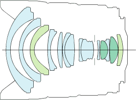 14 elements in 11 groups. Two Glass-Molded Aspherical elements. Two of UD glass. It uses lead-free glass, which means Canon isn't polluting Japan with lead in the dust created in shaping and polishing. (The older 1991-2006 lens has 14 elements in 10 groups, including a hand-ground Aspherical.)