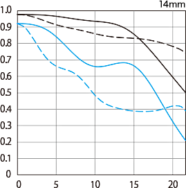 Canon MTF wide-open at f/2.8 at 10 cyc/mm (black) and 30 cyc/mm (blue). Sagittal (solid) and meridional (dashed). The published MTF is excellent, far sharper in the corners than my original Canon 14mm f/2.8. It's about the same as Nikon's 14mm f/2.8 AF. Nikon's new 14-24mm f/2.8 zoom is rated far better than any of these other three fixed 14mm lenses. Of course these MTFs are dreams, which mean they are calculated, not measured from real lenses. Nothing is said if the published graphs are monochromatic, polychromatic, or integrated over white light, so they mean very little for comparison to real samples of lenses. Don't lose sleep over any of this.