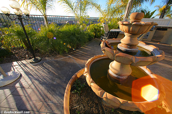 Flare and Ghosts performance top If I let the sun shine into the lens just outside the field of view, I get an orange blob opposite the sun. I rarely will see the smaller ghosts nearer the sun. Canon 14mm f/2.8 Ghosts at f/9. Here's a live example of how the photographer is responsible for ghosting, not the lens. Don't want ghosts? Then move your hand to shade the lens from the sun. Move your mouse over the sun to fix them in the example above. I haven't found that yellow ghost to be a problem with the sun in the image, only if it's just outside the image before it gets caught by the mechanically protective vestigial hood. The little built-in hood can't do much on its own. I made these images right after one another without moving my feet. The small fraction of an inch (cm) I naturally moved from one shot to the other is responsible for the change in perspective. I was only inches (cm) away from the fountain.