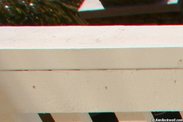 Lateral Color Fringes performance top As you can see in the super-close crops above, the Canon 14mm f/2.8 L is decent considering its angle of view. The Canon 14mm f/2.8 L is approved by the PPLFPA, Professional Patio and Lawn Furniture Photographers' Association, with a grade of "B." If you worry about this, get DxO which completely eradicates lateral color. This is a crop from 100% magnification of the top left center of the balcony image shown above at Distortion. At this magnification, the complete image would print at 44" (1.1m) wide. Crop from Canon 14mm f/2.8L on Full-Frame 5D. Roll mouse over to see after DxO. The two images move a bit because of the distortion correction. If I wanted, I could have unchecked the distortion correction just to show the chromatic correction, but tough! I made these shots the first day I got the software, and in full auto mode to boot.