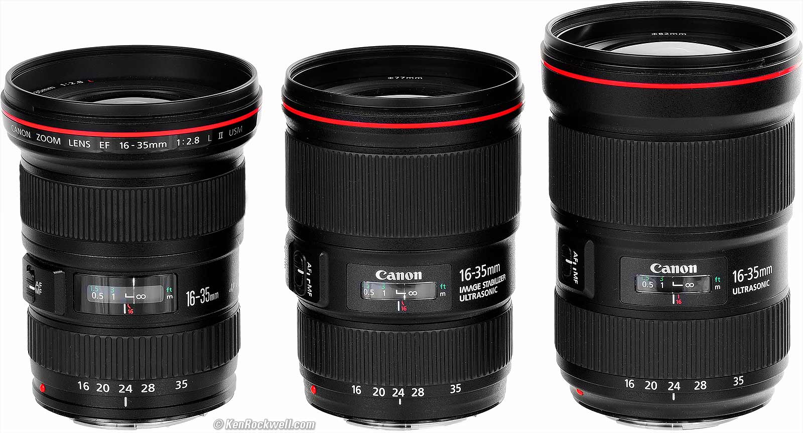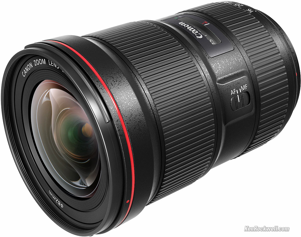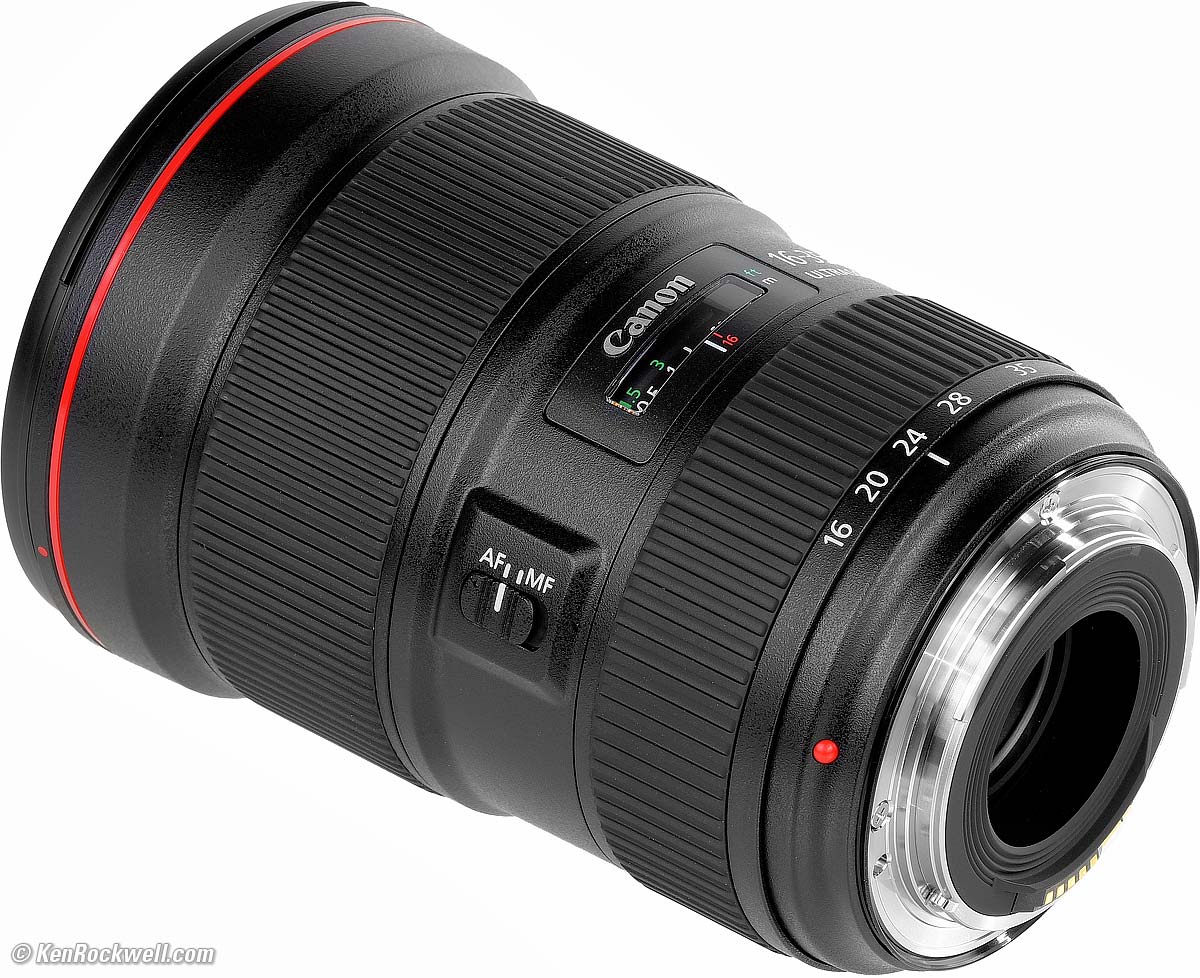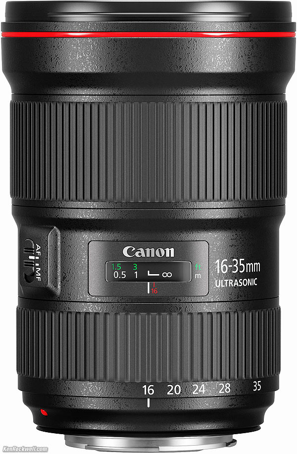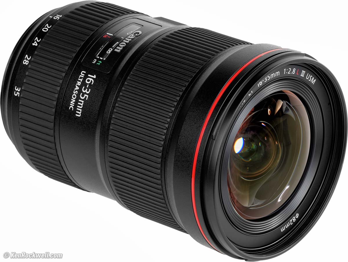 RecommendationsTop Sample Images Intro Specifications Performance Compared Recommendations This is clearly Canon's best ultrawide for news, action and sports where we need a faster aperture for faster shutter speeds to stop motion — or for astronomy. It's also Canon's newest, biggest and heaviest ever. This lens has no Image Stabilization; it freezes subject and camera motion with its faster f/2.8 speed. For nature and landscapes where things hold still, the 16-35mm f/4 L IS is just as sharp, less than half the price, smaller and lighter — and adds a stabilization system so we can leave the tripod at home. For most people reading this, the 16-35mm f/4 L IS is a much smarter choice. This 16-35/2.8 III is for shooting action. The old 16-35mm f/2.8 L II is still a perfectly good lens, and it's smaller, lighter, tougher and less expensive. It's not as ultrasharp in the corners at f/2.8, but so long as you stop down it takes the same pictures. Likewise, the corner sharpness at f/2.8 doesn't matter unless you're shooting boring flat targets or things at infinity; for real 3D subjects the older lens is just as good. The very best protective filter is the 82mm Hoya multicoated HD3 UV which uses hardened glass and repels dirt and fingerprints, and is also multicoated. For less money, the B+W 82mm 010 is an excellent filter, as is the multicoated version and the basic multicoated Hoya filter, but the Hoya HD3 is the toughest and the best. Filters last a lifetime, so you may as well get the best. The Hoya HD3 stays cleaner than the others since it repels oil and dirt. I got mine at Adorama. I'd also get it at Amazon, at B&H or at Crutchfield. This all-content, junk-free website's biggest source of support is when you use those or any of these links to approved sources when you get anything, regardless of the country in which you live. Canon does not seal its boxes in any way, so never buy at retail or any other source not on my personally approved list since you'll have no way of knowing if you're missing accessories, getting a defective, damaged, returned, store demo or used camera. I use the stores I do because they ship from secure remote warehouses where no one gets to touch your new camera before you do. Buy only from the approved sources I use myself for the best prices, service, return policies and selection. Thanks for helping me help you! Ken, Mrs. Rockwell, Ryan and Katie.