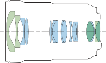 Optics16 elements in 11 groups. 2 aspherical elements: one molded glass and one ground glass. Fluorine front and rear coatings for dirt and oil resistance. Subwavelenth and Air Sphere coatings to reduce flare and ghosting. The front and rear groups move inside the stationary outer barrel as zoomed. Use a filter, and nothing moves externally.