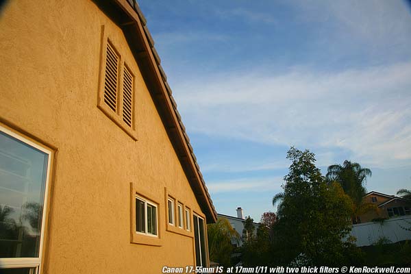 USE WITH FILTERS back to Performance or back to Introduction. The 17-55mm IS works great with regular old filters. There is no need for expensive thin mount filters. Canon cautions only to use the Canon PL-C 77mm II filter. I find it works great with my conventional, old-fashioned Hoya 77mm Circular Polarizer. I can use two fat, rotating-mount filters (13.7mm thick combined, excluding threads) as wide as 28mm. This includes my conventional Hoya 77mm Circular Polarizer and my Tiffen 0.6 ND rotating grad. There isn't much change as you zoom wider than 28mm; you can zoom out to 17mm and merely crop a little, even with these two stacked filters. There isn't any change with focused distance. Here's what you get at 17mm with both a 7mm thick Tiffen 0.9 ND and my 17mm thick Hoya 77mm Circular Polarizer (13.9mm thick combined, excluding threads): Filter vignetting at 17mm at f/11. Roll mouse over to see it at f/2.8. Like many lenses, filter vignetting seems worse at larger apertures as the effective image of the black edge of the filter is defocused more and blends further into the image. This effect doesn't change much until you zoom to 28mm, at which point it goes away.