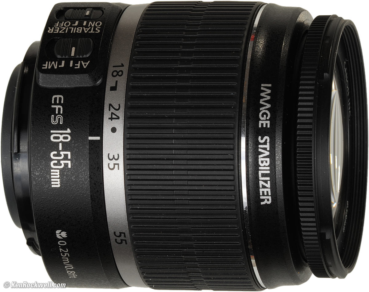 Introduction top Intro Specs Performance Recommendations Canon announced this lightweight lens along with the Canon 40D in August, 2007. It's an inexpensive ($150) basic lens which adds image stabilization (IS) to the previous 18-55mm EF-S II lens. As an EF-S lens, it works only on the 2003 and newer 1.6x digital cameras. It will not work on full-frame, film, 1.3x professional or the old 10D, D60, or D30 cameras. I'm an IS addict, but IS is only useful if you like to shoot still subjects hand-held in dim light. It's not useful if you shoot flash or moving subjects, and with a normal-range lens, not that big a deal in any case. Canon 18-55mm IS. enlarge.