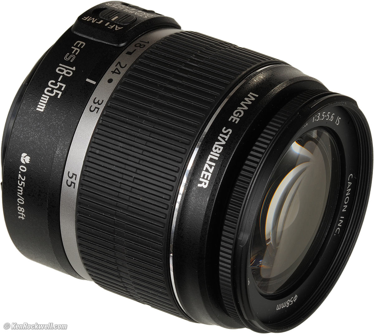 Canon EF-s 18-55mm f/3.5-5.6 ($150, plastic mount, 58mm filters, 7.1oz/200g) enlarge. I'd get mine at Adorama or Amazon. It helps me keep adding this site when you get yours from these links, thanks! Ken.