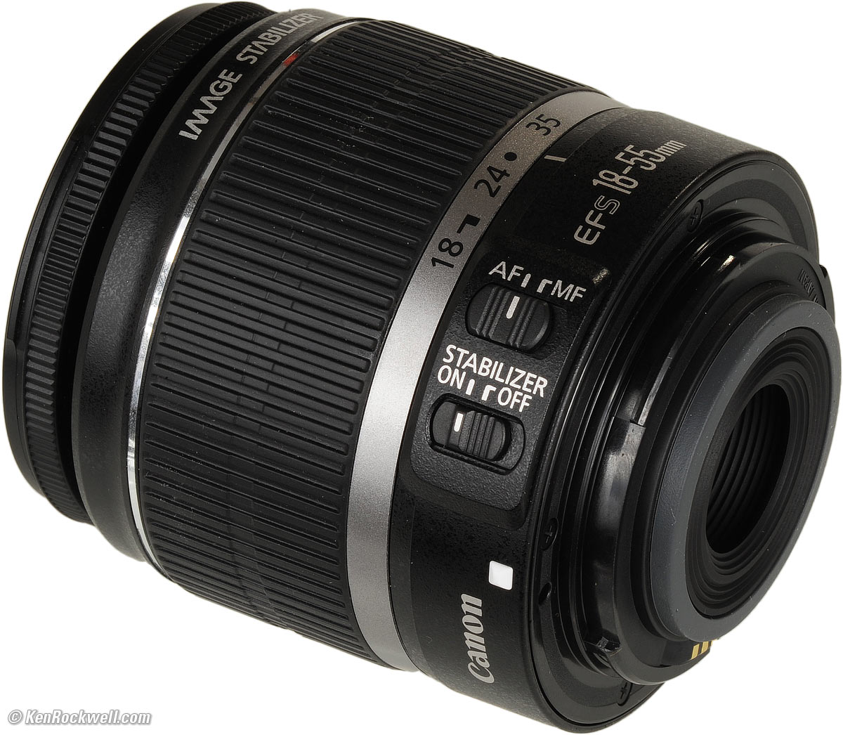Canon calls this the EF-S 18-55mm f/3.5-5.6 IS. EF: Electronic Focus. All modern Canon lenses focus with a motor in the lens. -S: Only works on newer, small (1.6x factor) DSLRs, which are the 40D, 30D, 20D, 20Da (astronomical), Digital Rebel XTi, Digital Rebel XT and the original Canon Digital Rebel. IS: Image Stabilization, which means no tripod needed except at night. See Why IS Matters. Canon claims 4 stops improvement.