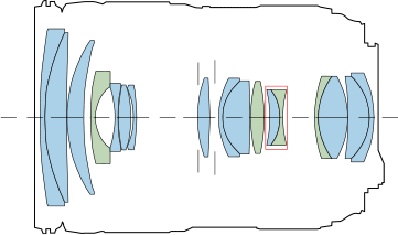 OpticsInternal construction. Aspherical elements and stabilizer group. 17 elements in 12 groups. 4 aspherical elements. Fluorine front and rear coatings for dirt and oil resistance. Air Sphere coatings to reduce flare and ghosting.
