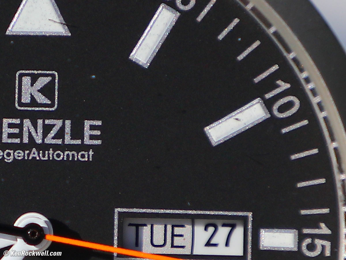 1,200 x 900 pixel crop from above. bigger. If this crop is about 6" (15cm) wide on your screen, then the complete image printed at this same extreme magnification would be about 44 x 30" (120 x 75 cm). If this crop is about 12" (30cm) wide on your screen, then the complete image printed at this same extreme magnification would be about 88 x 60" (250 x 150 cm). This is wide-open; it's much sharper at normal apertures. Remember that nothing other than some of the paint on the watch face is actually in focus; depth-of-field is vapor-thin at macro distances on all lenses.