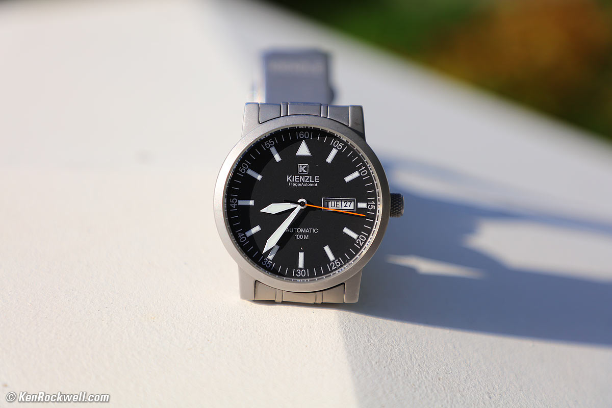 MacroMacro performance is pretty good, and bokeh is also great at macro distances: Kienzle Flieger Automat 800/2843 at close-focus distance at 105mm wide-open at f/4, 27 December 2016. bigger.