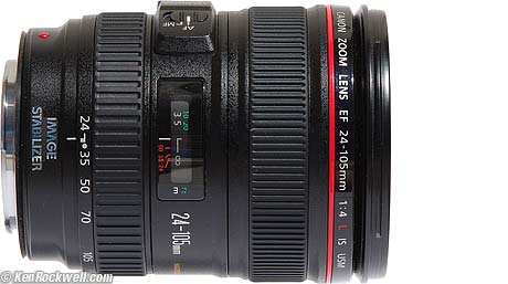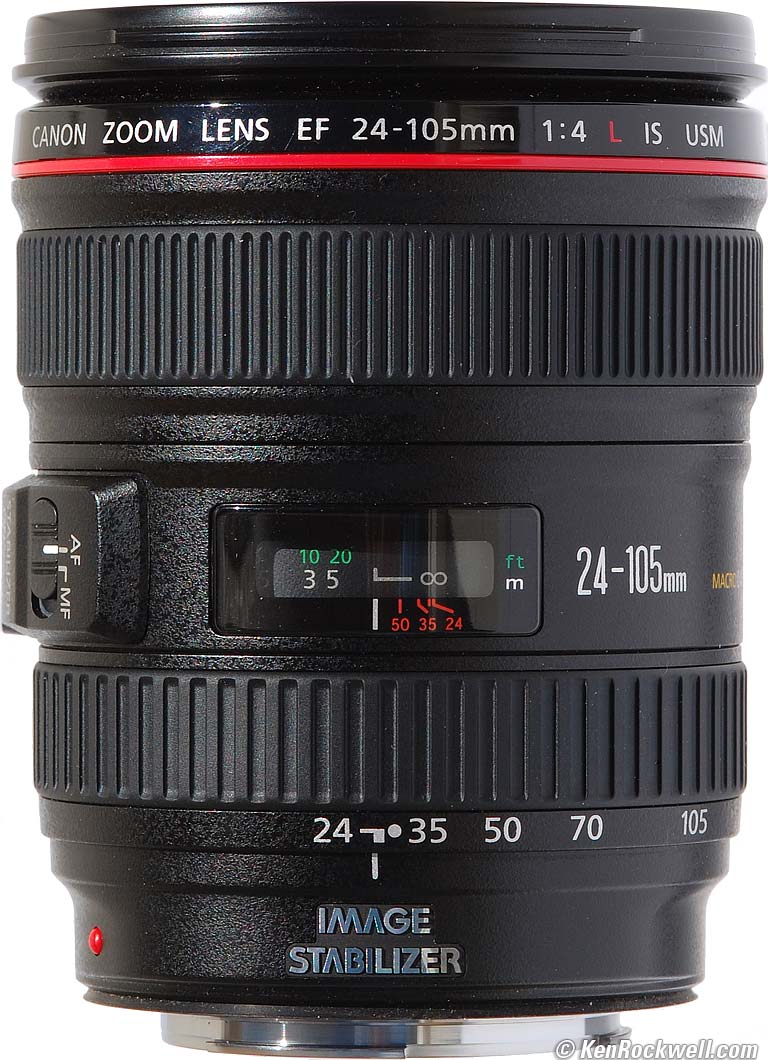 Recomendations top Intro Specs Performance Compared Recommendations I'd get mine at B&H, or at Amazon, or used at eBay. This free website's biggest source of support is when you use those or any of these links when you get anything, regardless of the country in which you live. Thank you! Ken. The optics are excellent, but I found the Canon 24-105mm f/4L IS difficult to use because of its cramped and stiff zoom ring. Try one for a few hours before you keep one. If your fingers are fine, it's a fantastic lens. For me, it was just plain weird that my fingertips felt worn off and that I couldn't enjoy smooth, precise setting of wide focal lengths. Get this 24-105mm for use on full-frame and 1.3x cameras. If you worry about distortion or light falloff, get the DxO software which eliminates it. The 24-105mm probably isn't the best chose for a 1.6x camera. Get the Canon 17-55mm f/2.8 IS or 17-85mm IS instead, since they cover a more appropriate mid-range and you're not paying for format capacity unused with these smaller cameras. The Canon 24-70mm f/2.8 L is better made and has a much better zoom system without the congestion at the wide end. If I was in the market for a miodrange zoom for my full-frame Canon, I'd get the 24-70mm instead. See them compared.
