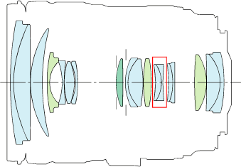 Optics 18 elements in 13 groups, including one glass molded aspherical, two plastic-resin-on-glass (replica) asphericals and an element of Super-UD glass. UD glass is the same as Nikon's ED glass, which helps reduce color fringing. Five-group zooming.