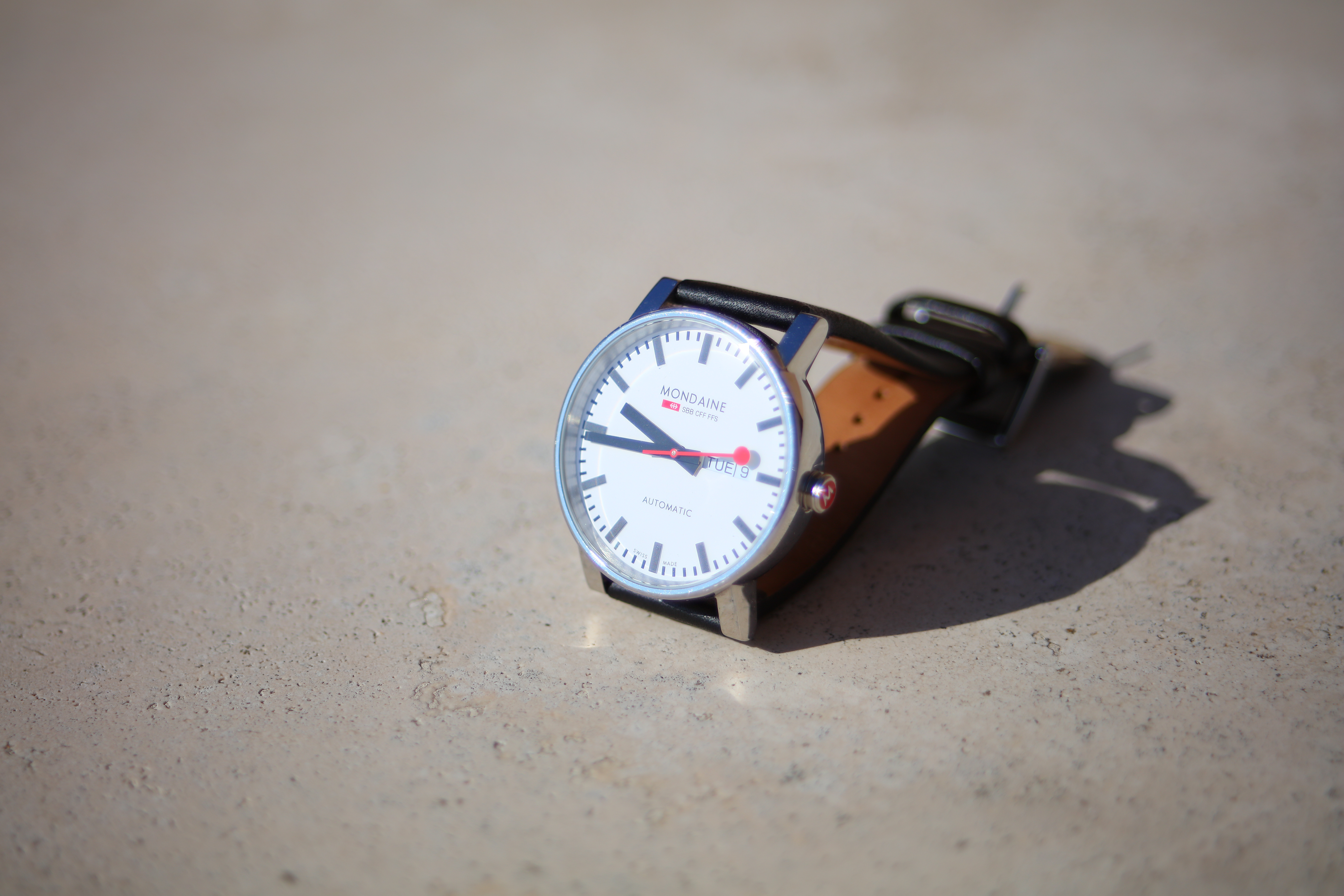 Spherochromatism performance topSpherochromatism, also called secondary spherical chromatic aberration or "color bokeh," is an advanced form of spherical and chromatic aberration in a different dimension than lateral chromatic aberration. It happens mostly in fast normal and tele lenses when spherical aberration at the ends of the color spectrum are corrected differently than in the middle of the spectrum. Spherochromatism can cause colored fringes on out-of-focus highlights, usually seen as green fringes on backgrounds and magenta fringes on foregrounds. Spherochromatism is common in fast lenses of moderate focal length when shooting contrasty items at full aperture. It goes away as stopped down. Its spherochromatism is hidden mostly by regular spherical aberration at close distances: Mondaine A132.30348.11SBB at close-focus distance, 09 November 2021. Canon 5DS/R, EF 28-80mm f/2.8-4L USM at 80mm at f/4 at 1/2,500 at Auto ISO 100, (LV 15.4). bigger or camera-original © file.