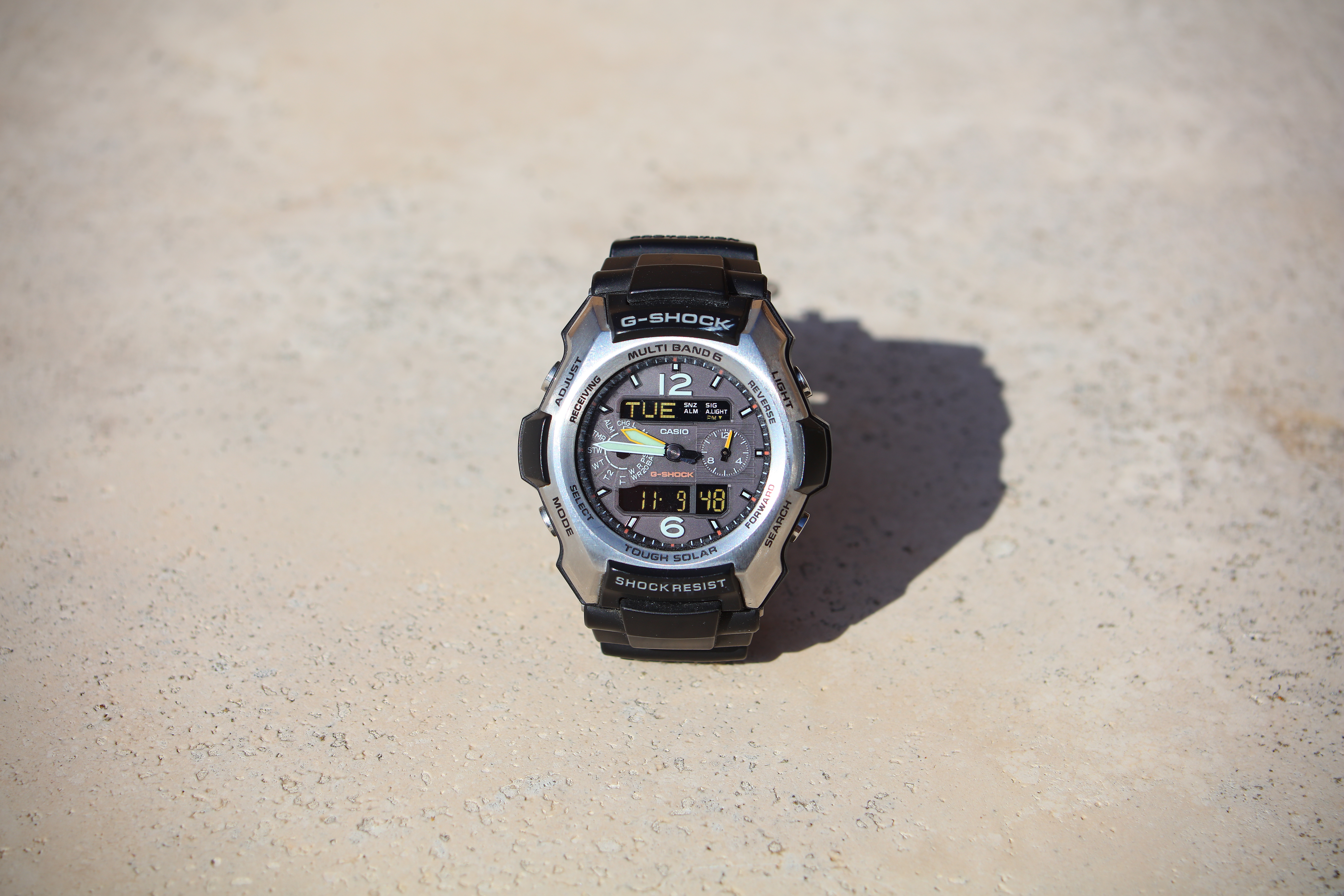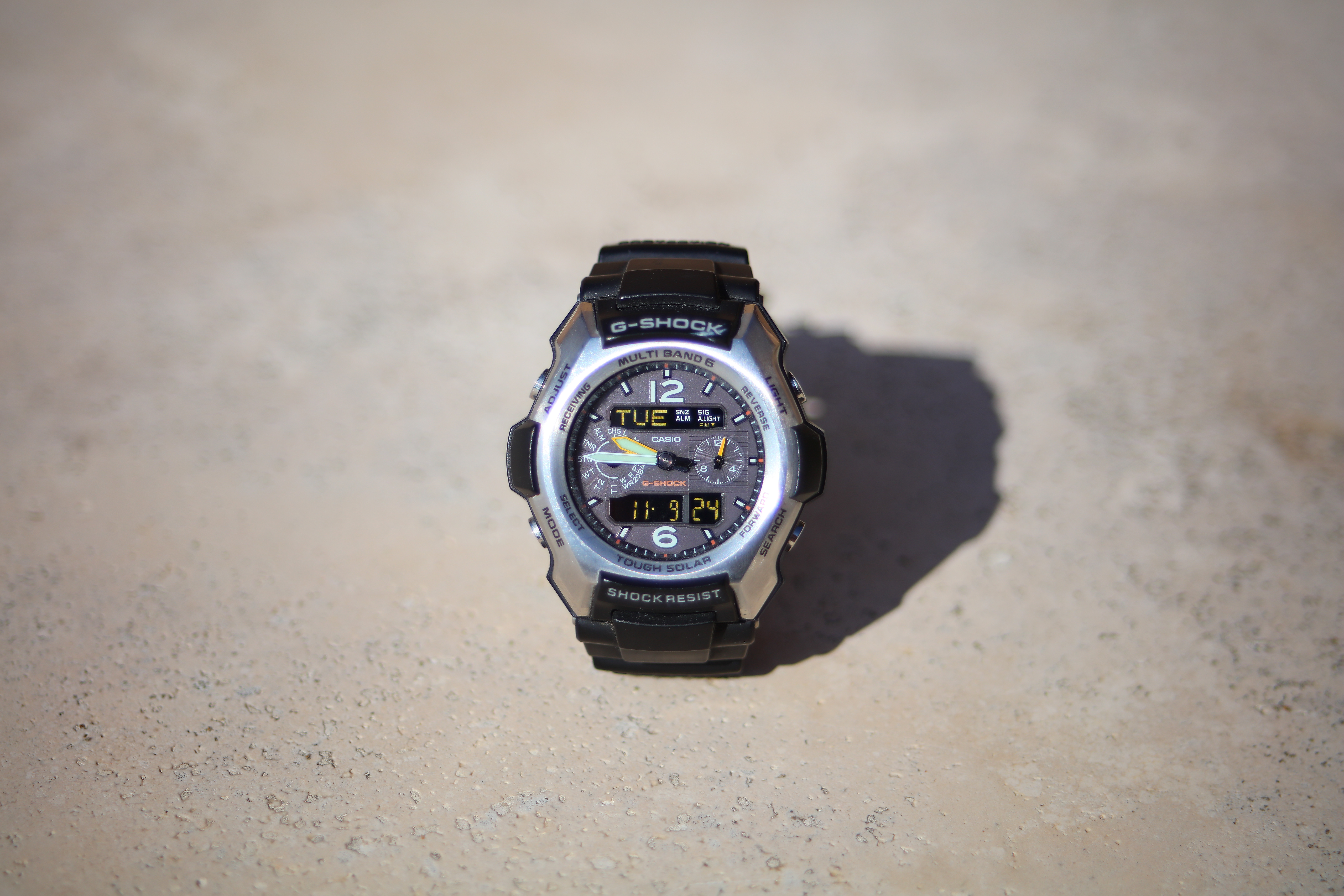 Casio G-Shock Solar Atomic Watch at close-focus distance, 09 November 2021. Canon 5DS/R, EF 28-80mm f/2.8-4L USM at 80mm at f/10 at 1/400 at Auto ISO 100, (LV 15¼). bigger or camera-original © file.