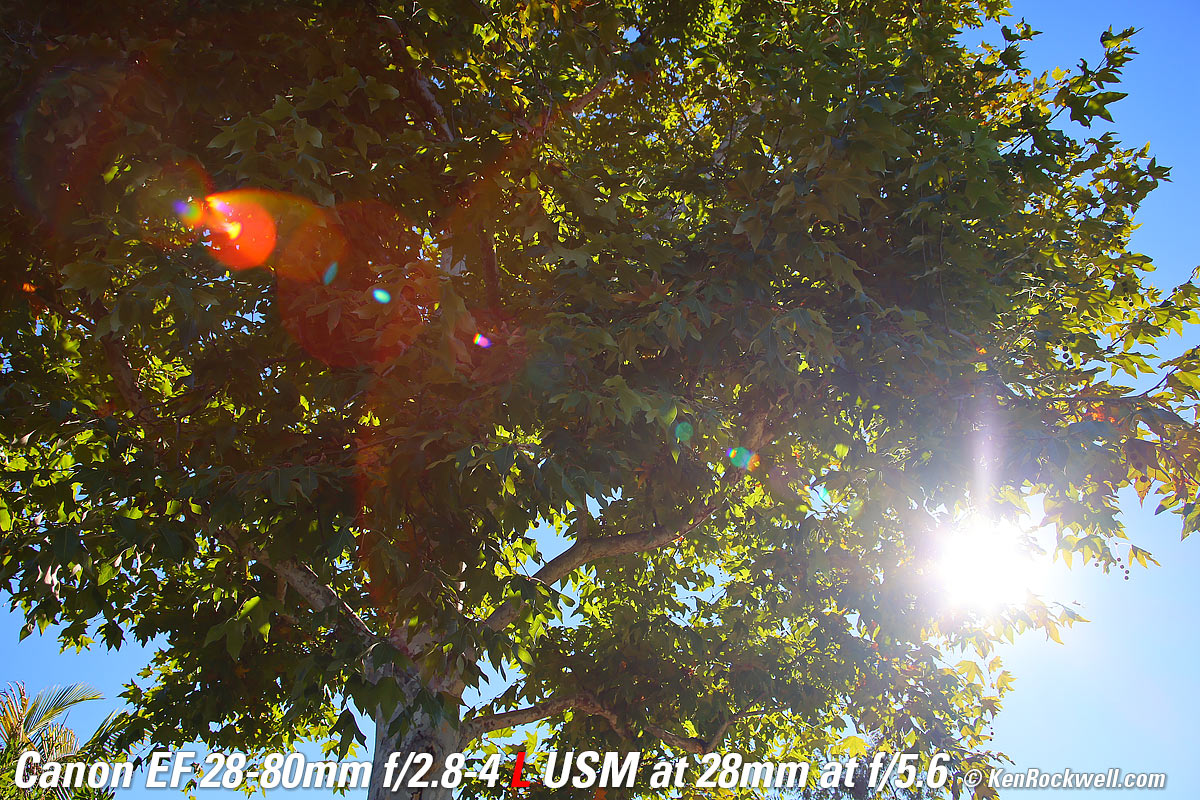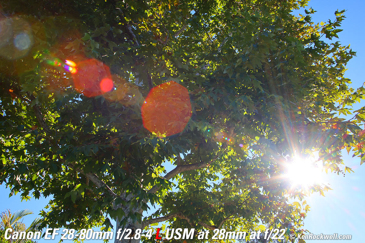 Sunstars performance topI see little in the way of sunstars. The best I can get are mild 8-pointed sunstars on brilliant points of light at the smallest apertures. Ignore the vertical smear at large apertures, this is a sensor artifact called interline transfer smear and not a lens defect. Likewise ignore the crazy rainbow effects at small apertures; these are sensor artifacts caused by taking a picture directly of the sun and exposing for the dark underside of a huge tree, and using that same tree to hide the sky to accentuate the stars. Click any to enlarge (shot on Canon EOS R5): Click any to enlarge (Canon EOS R5).
