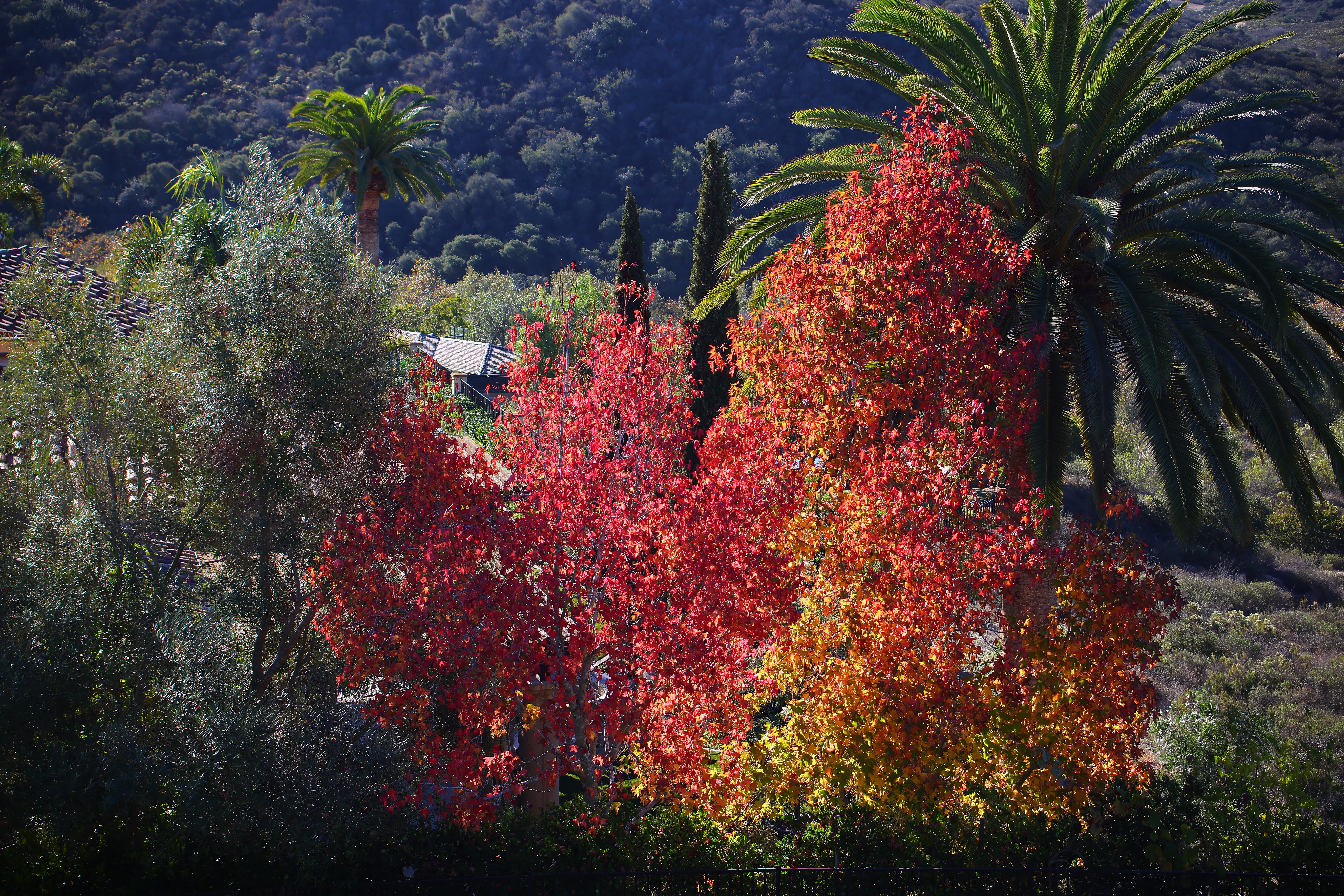 Autumn Color in Paradise, 8:42 AM, Thursday, 11 November 2021. Canon R5, EF 28-80mm f/2.8-4L USM at 69mm at f/8 at 1/160 at Auto ISO 100, -1.3 stops exposure compensation to keep the vivid reds and yellows from saturating the red channel (LV 13.4), Perfectly Clear. bigger, full-resolution or camera-original © JPG file. Introduction topSample Images Intro New Good Bad Missing Compatibility Specifications Performance