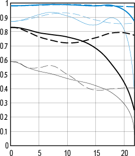 Coma performance top Coma, or saggital coma flare, is when points of light in the corners turn into batwing-shaped blobs. This is often a problem with fast normal or wide lenses. I see coma at the largest stops, which is typical for these double-Gauss designs.
