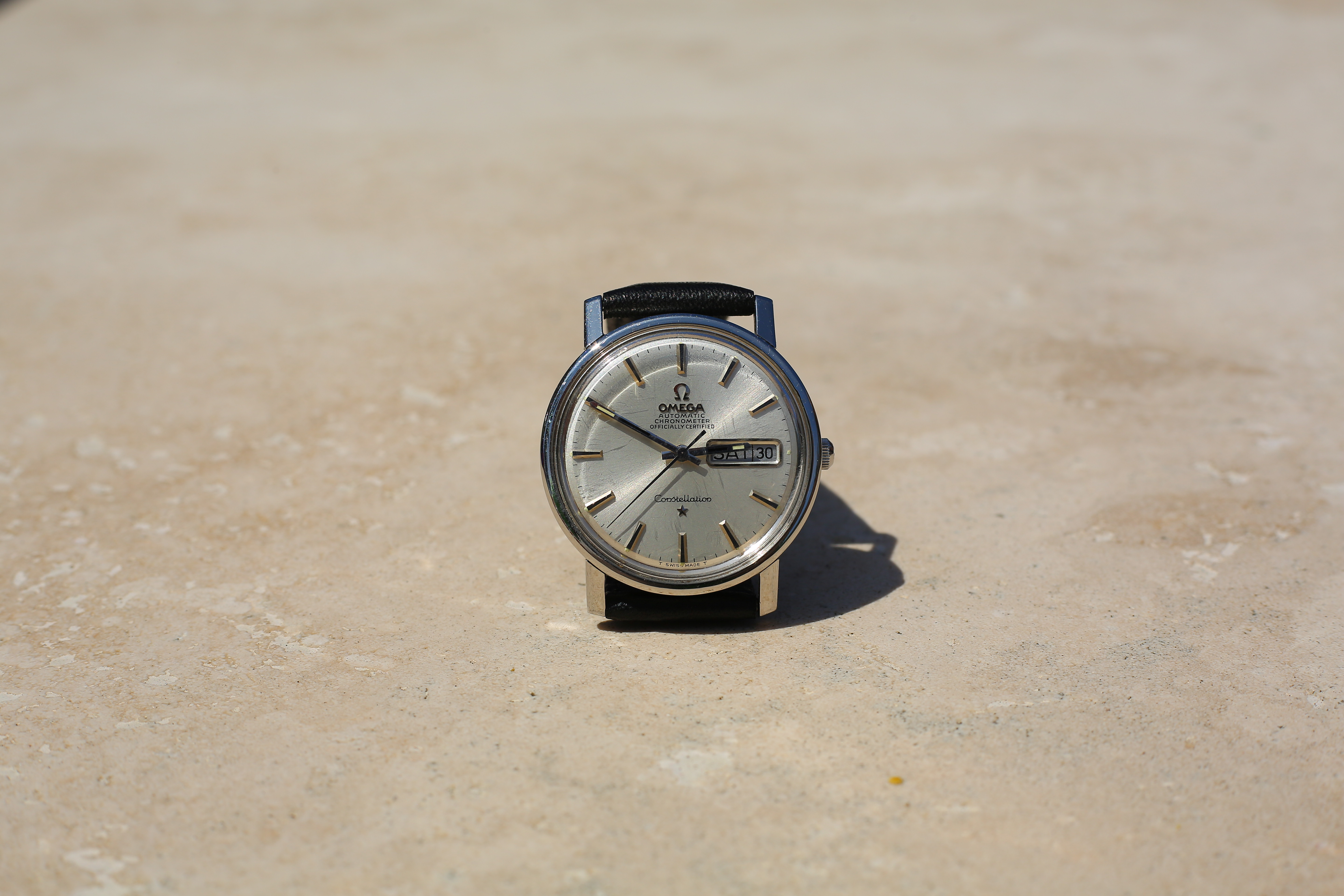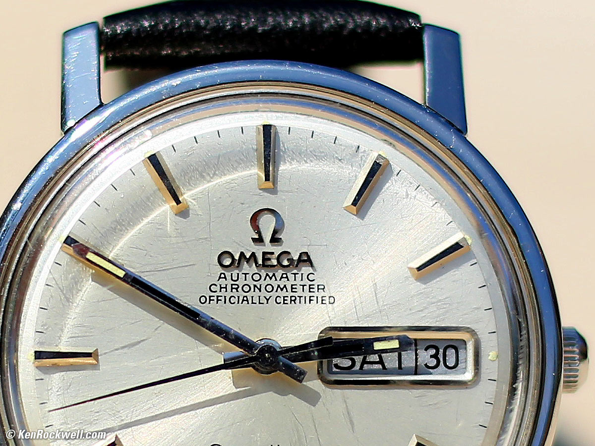 Macro performance top It gets closer than any other non-macro Canon 50mm lens: 1.1 feet or 0.35 meters from the image plane, which is just inches from the front of the lens. 1968 Omega Constellation at close-focus distance on full-frame at f/10. bigger or camera-original JPG. The images would be even tighter on smaller-format cameras (see crop factor). It's super-sharp; here's a 1,200 x 900 pixel crop from a 22MP full-frame image at 100%: Crop from above image at 100%. If this is 6" (15cm) wide on your screen, the full image would print at 20 x 30" (50 x 75 cm)! bigger or camera-original JPG. This is at f/10; it's softer wide open at macro distances due to spherical aberration. Here's a 1,200 x 900 pixel crop from an image shot at f/2.2 at 100%: Crop from similar image shot at f/2.2 at 100%. If this is 6" (15cm) wide on your screen, the full image would print at 20 x 30" (50 x 75 cm)! It's not quite as sharp at f/2.2, but tough, Canon's macro lenses aren't this fast! Blown up to this size, no one is going to complain. Do know that at f/2.2 the depth of field is shallower that the distance from the hands to the face; this all isn't in focus is it is behind a plastic crystal.