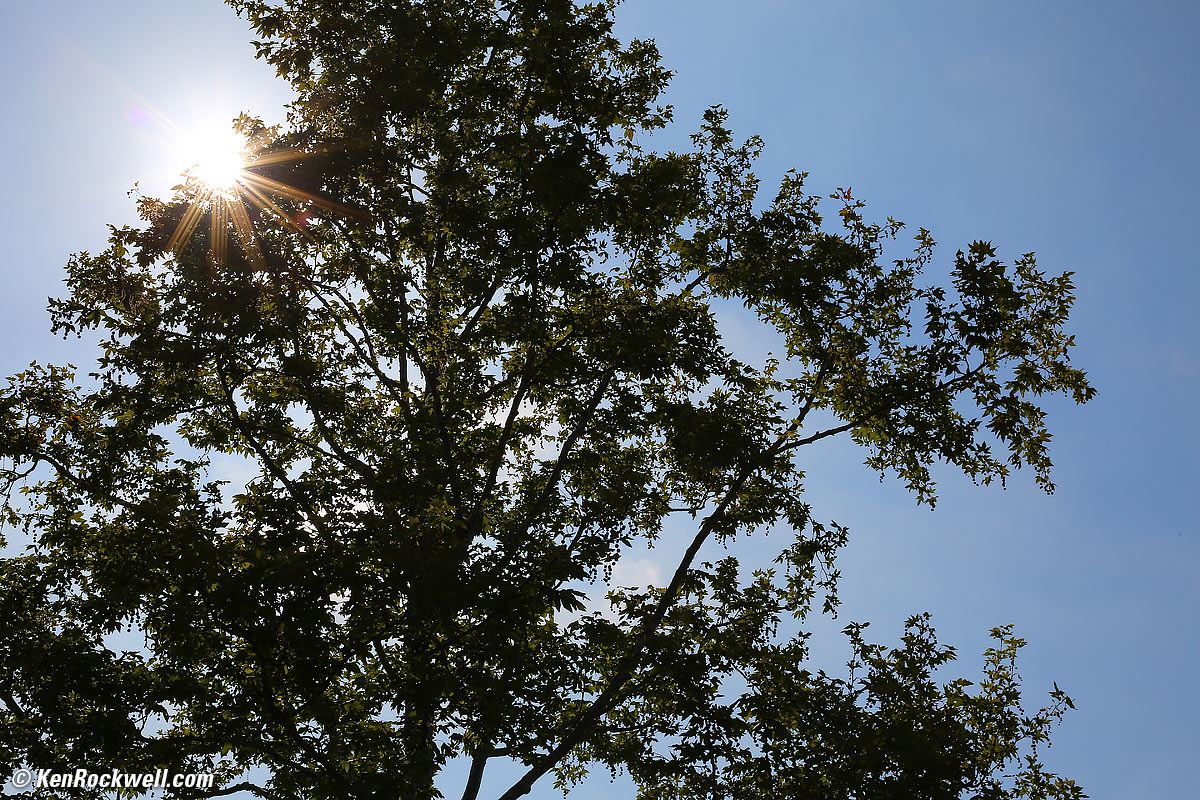 Flare and Ghosts performance top Flare performance is quite good. I can shoot with the direct disc of the sun in my image and get no significant ghosts. In this image, I went out of my way to include the direct disc of the sun as well as a backlit tree: At f/10, direct view of mid-day sun. Camera-original © JPG file.