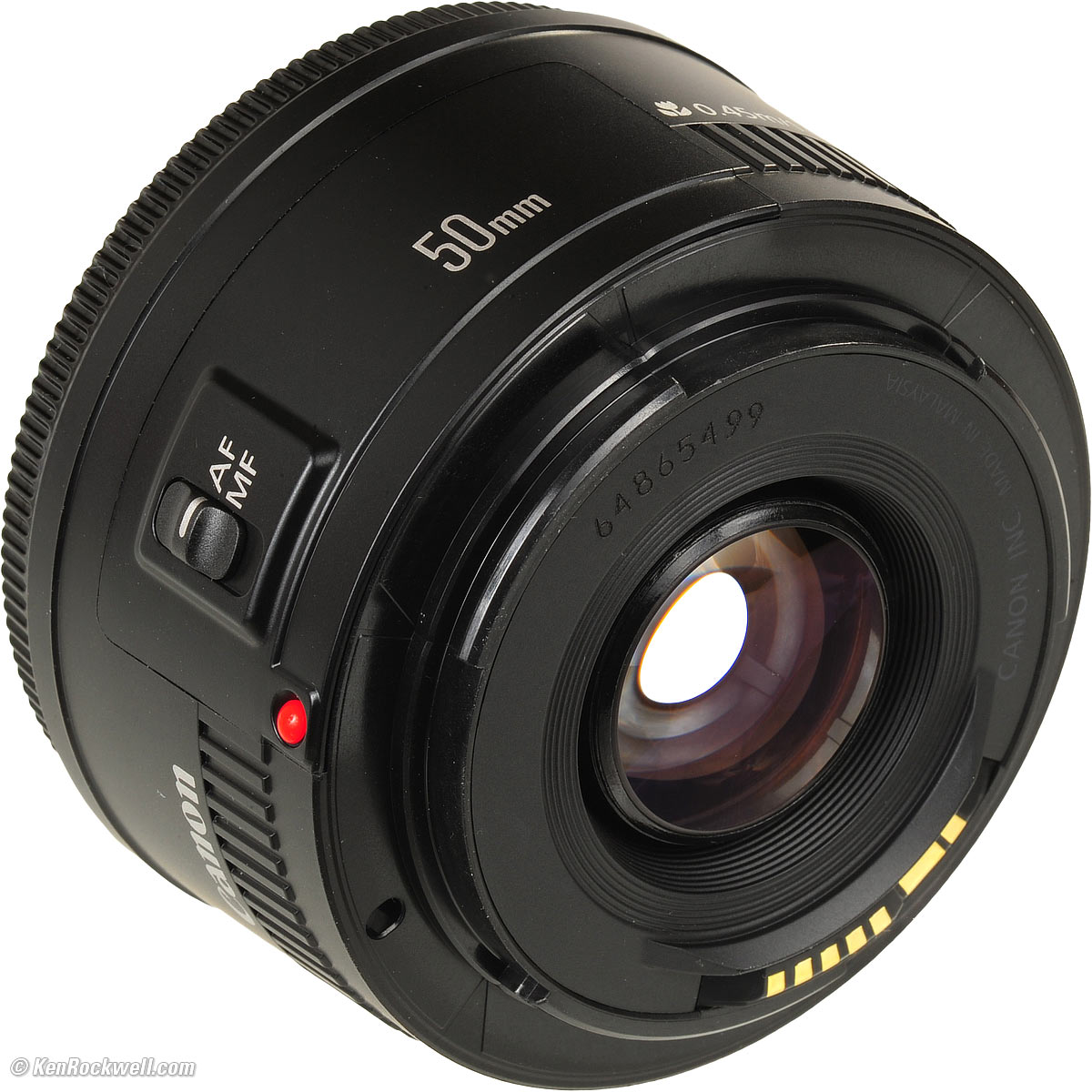 Ergonomics performance top Canon 50mm f/1.8 II (about actual size). Look, Ma, no focus scale! enlarge. As covered above, the biggest bad point about the 50mm f/1.8 II is that you have to move a switch if you want manual focus. The manual focus ring is just a piece of plastic, as Nikon's first AF lenses were in 1986. It turns 80º from infinity to 1.5 feet. There's no focus scale, but considering that Canon's other 50mm lenses with focus scales are so small that the depth-of-field scales are useless, it's not needed anyway. Focus scales are a throwback to the 1930s when cameras were focused by guessing or measuring the distance, and then setting it on the scale. This went out of style in by the 1950s, when the scale served as a computer for landscape photographers. Today, with no real depth-of-field scales on lenses, I won't fault Canon for saving us the $10 it might cost to add this. I like the plastic mount. It slides on and off my cameras much more smoothly and easily than my metal-mount lenses.