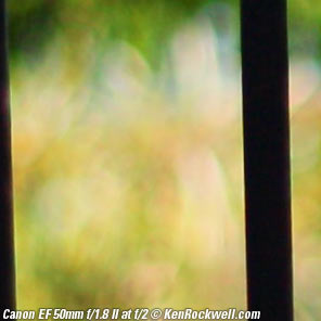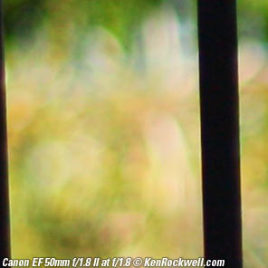 Bokeh performance top Bokeh, the quality of out-of-focus areas as opposed to the degree of defocus, is fair to good. It usually looks great in actual shooting because backgrounds are usually so far out of focus because of this lens' fast f/1.8 speed compared to slow f/2.8 zooms Here are crops from extremely enlarged prints of about 36 x 55" (100 x 150cm), or the equivalent of looking at Canon 5D Mark II images at 100% on-screen. In these examples, a vertically polarized phase lattice was set up at 3 meters (10 feet) on which the lens was focused, and the synthetic reference vegetation seen out of focus in the background was at 15 meters (50 feet).
