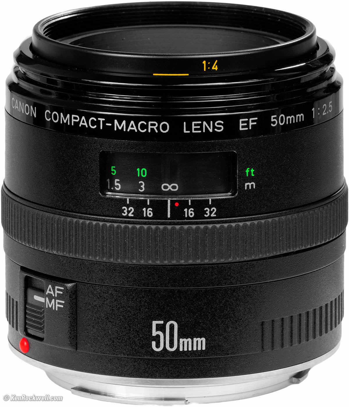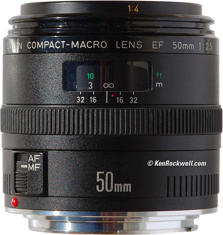 Canon EF 50mm f/2.5 Macro (52mm filter, 9.5 oz./269g, 1:2 macro, about $270 new or $165 used). enlarge. I'd get it at Adorama or at Amazon, or this link to it used at eBay (see How to Win at eBay). My biggest source of support for this free website is when you use those or any of these links when you get anything, regardless of the country in which you live — but I receive nothing for my efforts if you buy elsewhere. I'm not NPR; I get no government hand-outs and run no pledge drives to support my research, so please always use any of these links for the best prices and service whenever you get anything. Thanks for helping me help you! Ken. Good: Fast autofocus, super-sharp, no distortion, small, light and inexpensive makes it my favorite Canon 50mm lens. Bad: You have to move a switch for manual focusing.