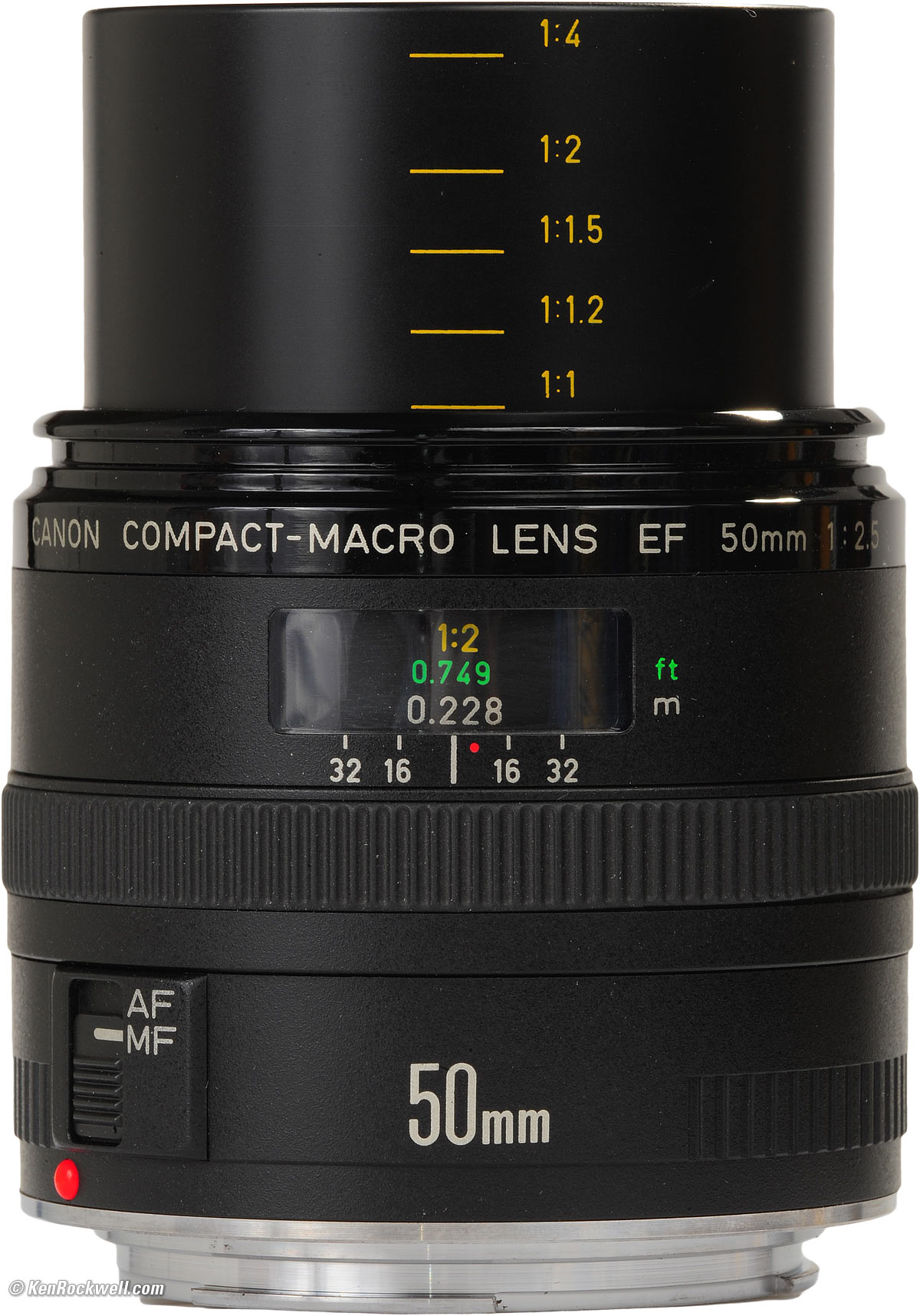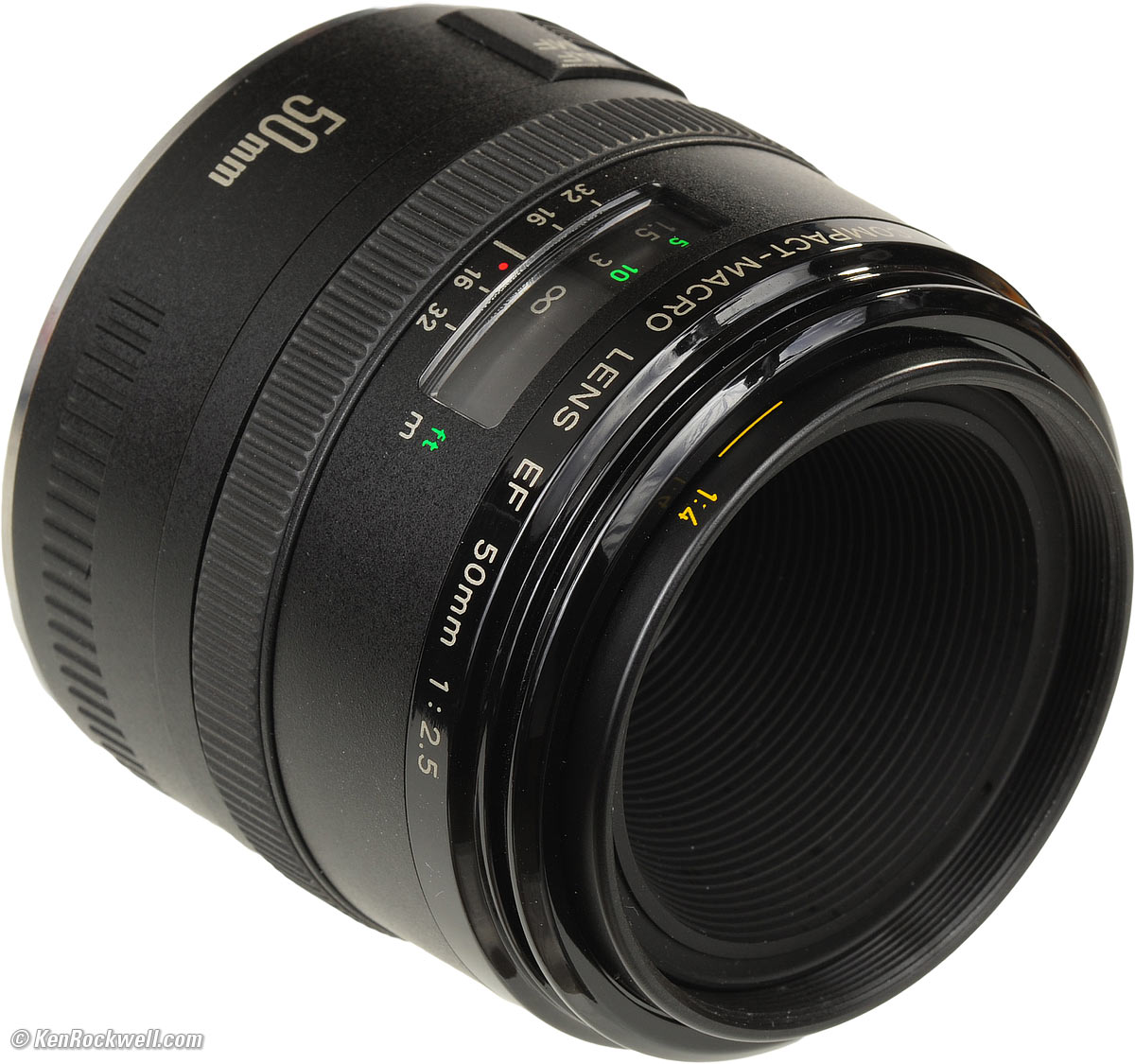 Recommendations top Intro Specifications Performance Compared Recommendations The Canon 50mm f/2.5 Compact-Macro is a superb choice as an all-around 50mm lens. it is the sharpest and the least distorting of any Canon 50mm lens. It may not be expensive, but this is Canon's best 50mm lens optically. It's not the fastest, but with the high ISOs of DSLRs, still works great in low-light, and gives a much deeper depth-of field and often higher AF accuracy than Canon's faster lenses. As a standard lens, this lens also focuses immediately to any close distance you might want; you never hit a stop at 1.5 feet (0.45m) as you do with Canon's other 50mm lenses. For dedicated macro use, longer lenses are far more practical since you won't be so close that you'll bloch your light or annoy your subjects, as you are apt to do with any 50mm lens. For serious macro use, I'd get a Canon 100mm f/2.8 or Canon 100mm f/2.8 L IS instead, just to open up the distance between the front of my lens and the subject. I first published this review on 06 December 2006, and rewrote it on 29 April 2010 with new data from a newer sample of this lens on the 5D Mark II.