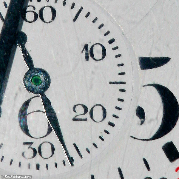 Crop from above image at 100%, shot at f/11. If this is 6" (15cm) wide on your screen, the full image would print at 40 x 25" (100 x 60 cm)! The sparkles aren't noise; they are the texture of the watch hands, crystal and face!