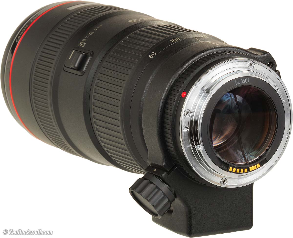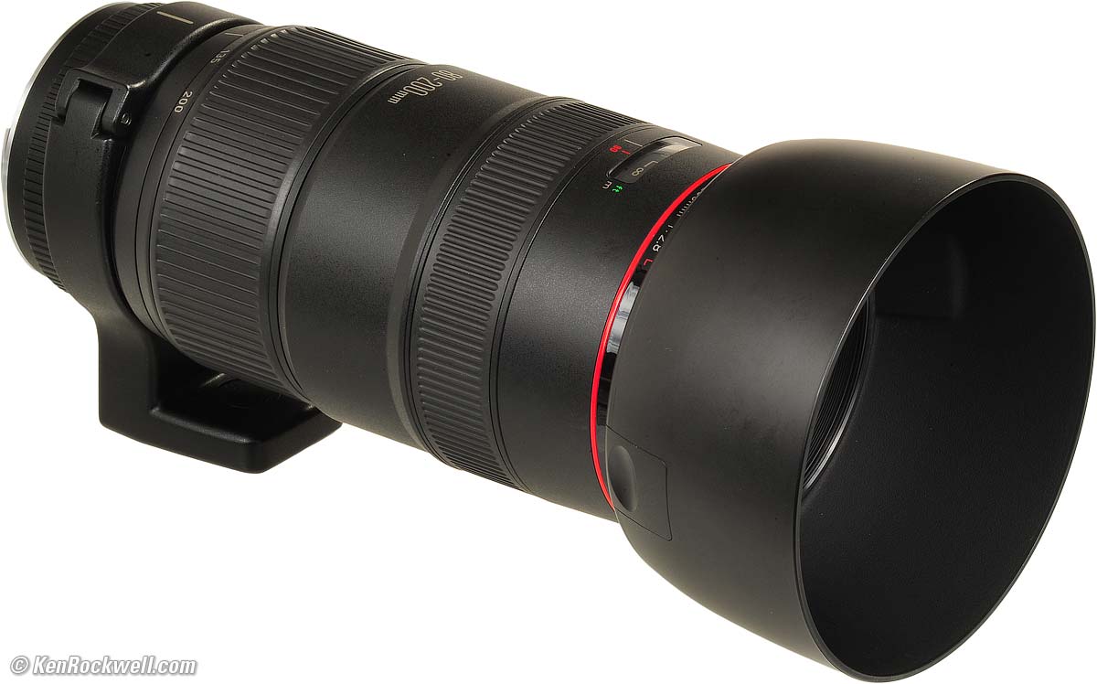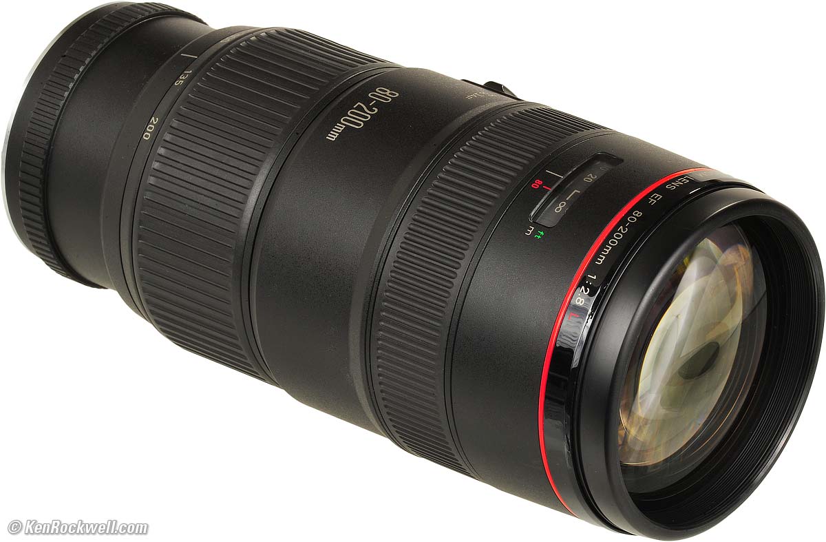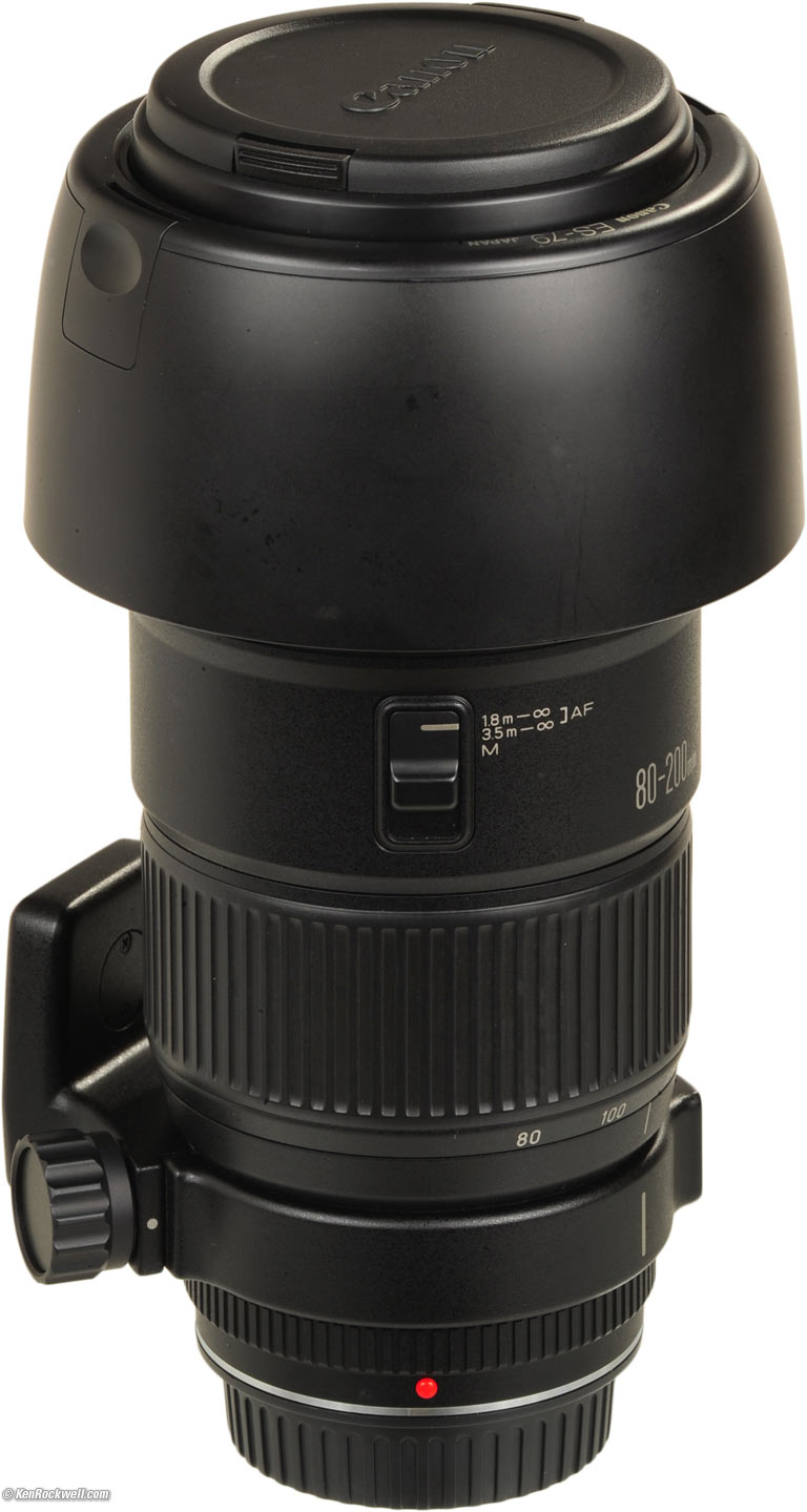 Canon EF 80-200mm f/2.8 L (72mm filters, 5.9 feet/1.8m close-focus, 49.8 oz./1,412g with included tripod collar, 45.0 oz./1,276g without collar as shown, about $350 used.) enlarge. This free website's biggest source of support is when you use these links, especially this link directly to them at eBay (see How to Win at eBay) when you get anything, regardless of the country in which you live. It helps me keep reviewing these oldies when you get yours through these links, thanks! Ken.