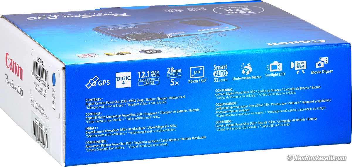 Where to Get YoursI got my D30 at B&H. I'd also get it at Adorama or at Amazon. This all-content, junk-free website's biggest source of support is when you use those or any of these links to approved sources when you get anything, regardless of the country in which you live. Canon does not seal its boxes in any way, so never buy at retail or any other source not on my personally approved list since you'll have no way of knowing if you're missing accessories, getting a defective, damaged, returned, store demo or used camera. I use the stores I do because they ship from secure remote warehouses where no one gets to touch your new camera before you do. Buy only from the approved sources I use myself for the best prices, service, return policies and selection. Thanks for helping me help you! Ken, Mrs. Rockwell, Ryan and Katie.
