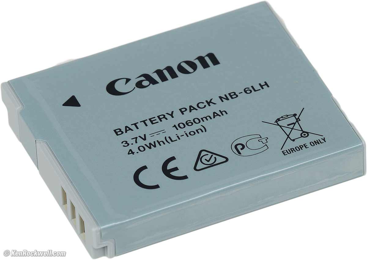 PowerBattery Canon NB-6LH battery. bigger. NB-6LH rechargeable lithium-ion battery. 3.7 V 1,060 mAh. 0 ~ 40ºC operating. 34.4 x 41.8 x 6.9mm (1.35 x 1.65 x 0.27"). 0.78 oz. (22g).