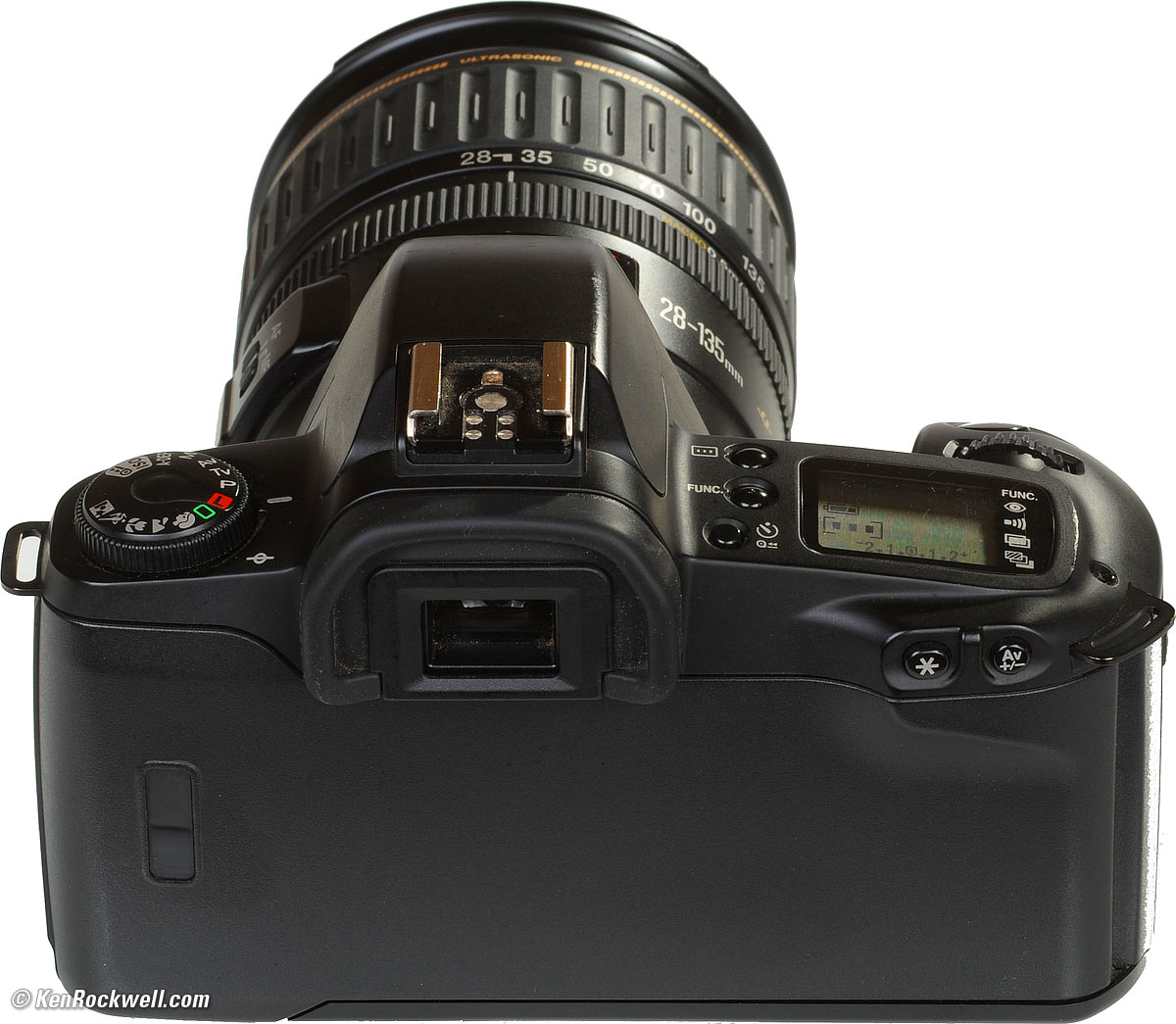 Usage top Intro Specs Performance Usage Recommendations Canon EOS Rebel G with 28-135mm IS. enlarge. The Rebel G is easy to figure out. The few functions are set by pressing the FUNC button on top and looking at the right of the LCD. You can set Red Eye mode, the beeper, multiple exposures and bracketing. It's so easy and well thought out it was obvious even without the User's Manual. The top LCD isn't illuminated, but it is big and clear. I had no problems reading it, but bring a small flashlight (or pop open your cell phone) if you want to read it for night shots outdoors.