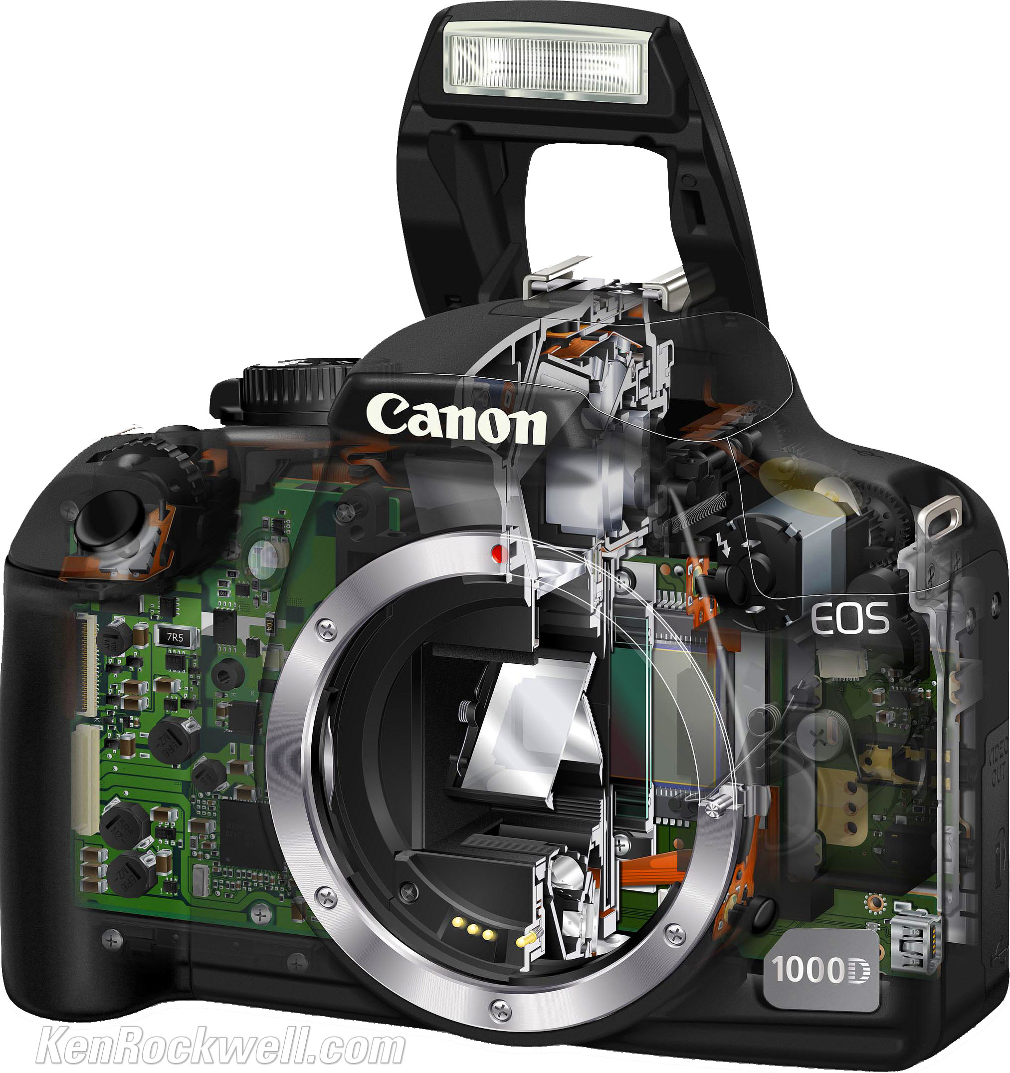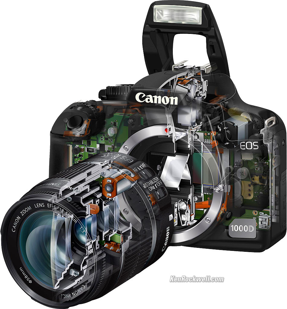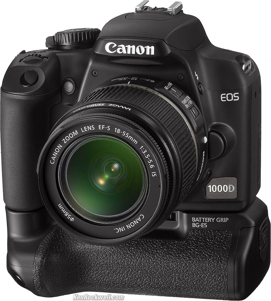 Introduction The Canon Rebel XS is the lightest DSLR even made by Canon. The Canon Rebel XS is a $699, 10 MP, 2.5" LCD DSLR which should ship in August 2008. It comes packaged with the 18-55mm IS lens for $699. It competes directly against the Nikon D60. What's new and interesting is Canon's Auto Lighting Optimizer, which if it works as well as Nikon's Automatic Dynamic Range Adjustement, will be a huge help in making significantly better pictures. The new Canon Rebel XS is also called the EOS 1000D in Europe and Korea, and the Kiss F in Japan. Back. enlarge. Specifications Camera Type: Canon DSLR. Uses all Canon EF and EF-S lenses. Menus and most settings are the same as all the other excellent Canon DSLRs. Flash: Pop-up, ISO 100 GN 43' (13m). Depth-of-Field Preview: Yes. Size: 5.0 x 3.8 x 2.4" (126.1 x 97.5 x 61.9 mm). Weight: 15.9 oz. (450g). Top. enlarge. AF, Finder, LCD and Live View AF: 7 sensors. Finder: Lightweight Pentamirror. 21mm eyepoint, which sounds too good to be true. 95% coverage, -3 to +1 diopters. LCD: 2.5," 230,000 dots. Live View: Yes, and also on a remote computer with EOS Utility software. Front Cutaway (Rebel XS is called EOS 1000D in Europe). enlarge or enrapture. Rear Cutaway (Rebel XS is called EOS 1000D in Europe). enlarge or enrapture. Sensor, Frame Rate and Shutter Sensor: 10 MP CMOS, 22.2 x 14.8mm (1.6x), 3,888 x 2,592 pixels native. Self-cleaning. ISO: 100 - 1,600. Frame Rate: 3 FPS (only 1.5 FPS in raw). Buffer Depth: Unlimited. The Rebel XS writes to the card faster than it can shoot. Shutter: 1/4,000 - 30s and Bulb. Maximum speed with flash (sync speed): 1/200. Front Cutaway with lens (Rebel XS is 1000D in Europe). enlarge or enrapture. Data Buffer Depth: 514 shots (only 4 or 5 in raw). Memory: SD and SDHC cards. Formats: JPG and raw, also simultaneous raw + JPG. Color Spaces: sRGB and Adobe RGB. Canon EOS 1000D with BG-E5 Grip. (Rebel XS is 1000D in Europe). enlarge. Practicalities Included: EF-S18-55mm f/3.5-5.6 IS zoom lens, rechargeable battery and charger, USB and video cables, neckstrap, software CD, and a 1-year warranty. Announced: 08 July 2008 in USA, 16 June 2008 rest-of-world. Price: $699 with 18-55mm IS lens. Available: August 2008.